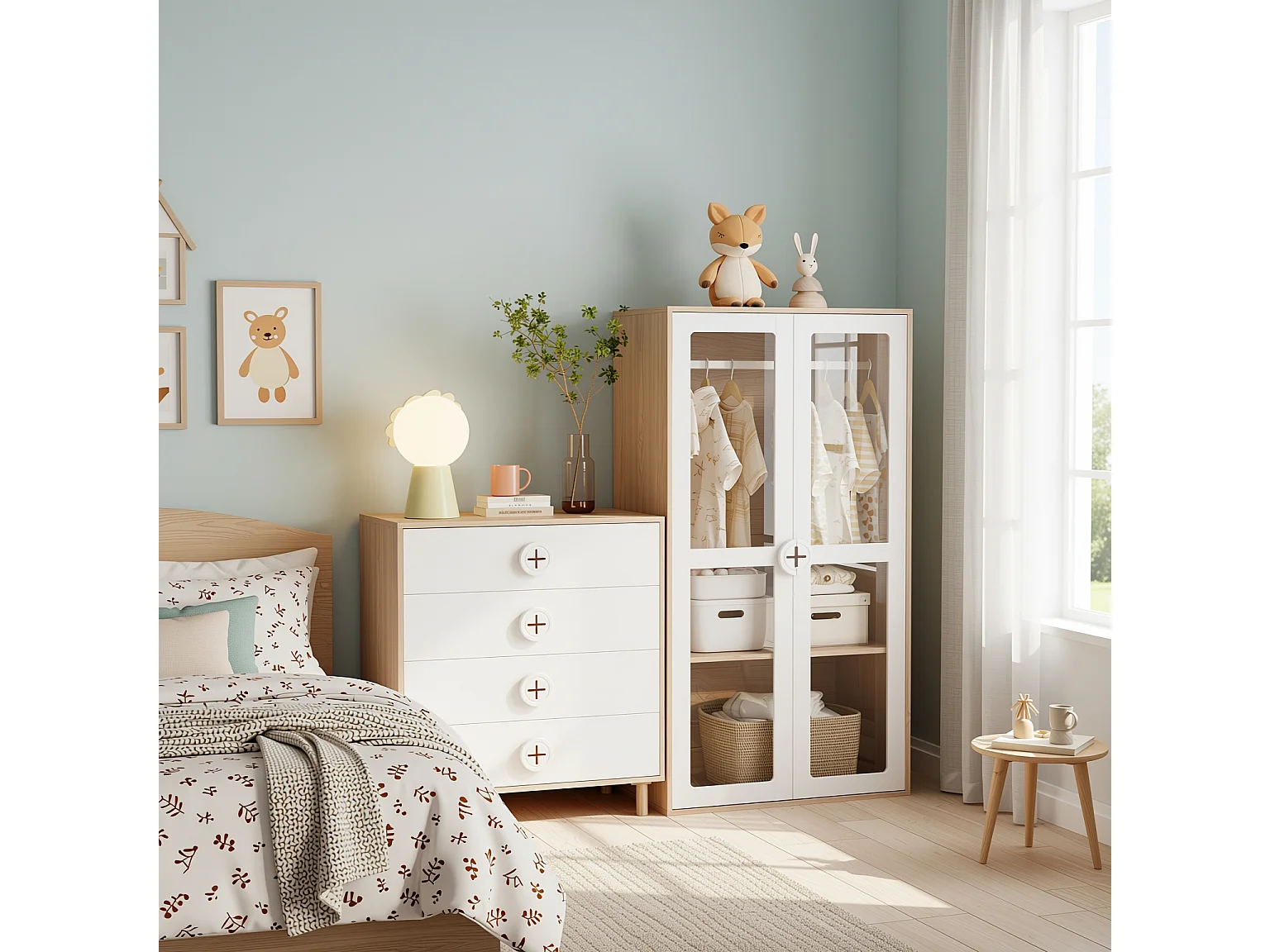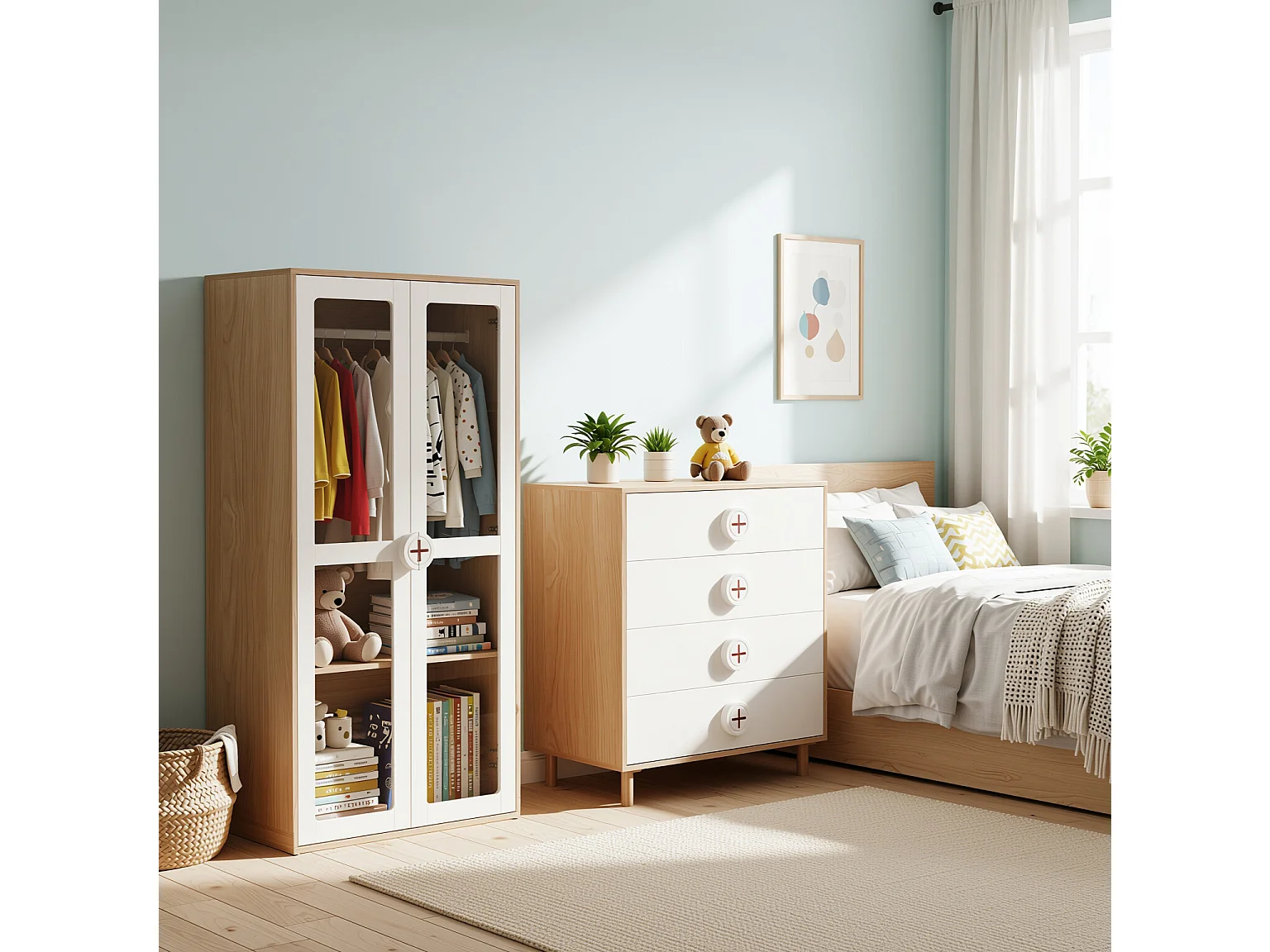 URBAN MEUBLE Ensemble de armoire portes vitrées + commode 4 tiroirs bicolores