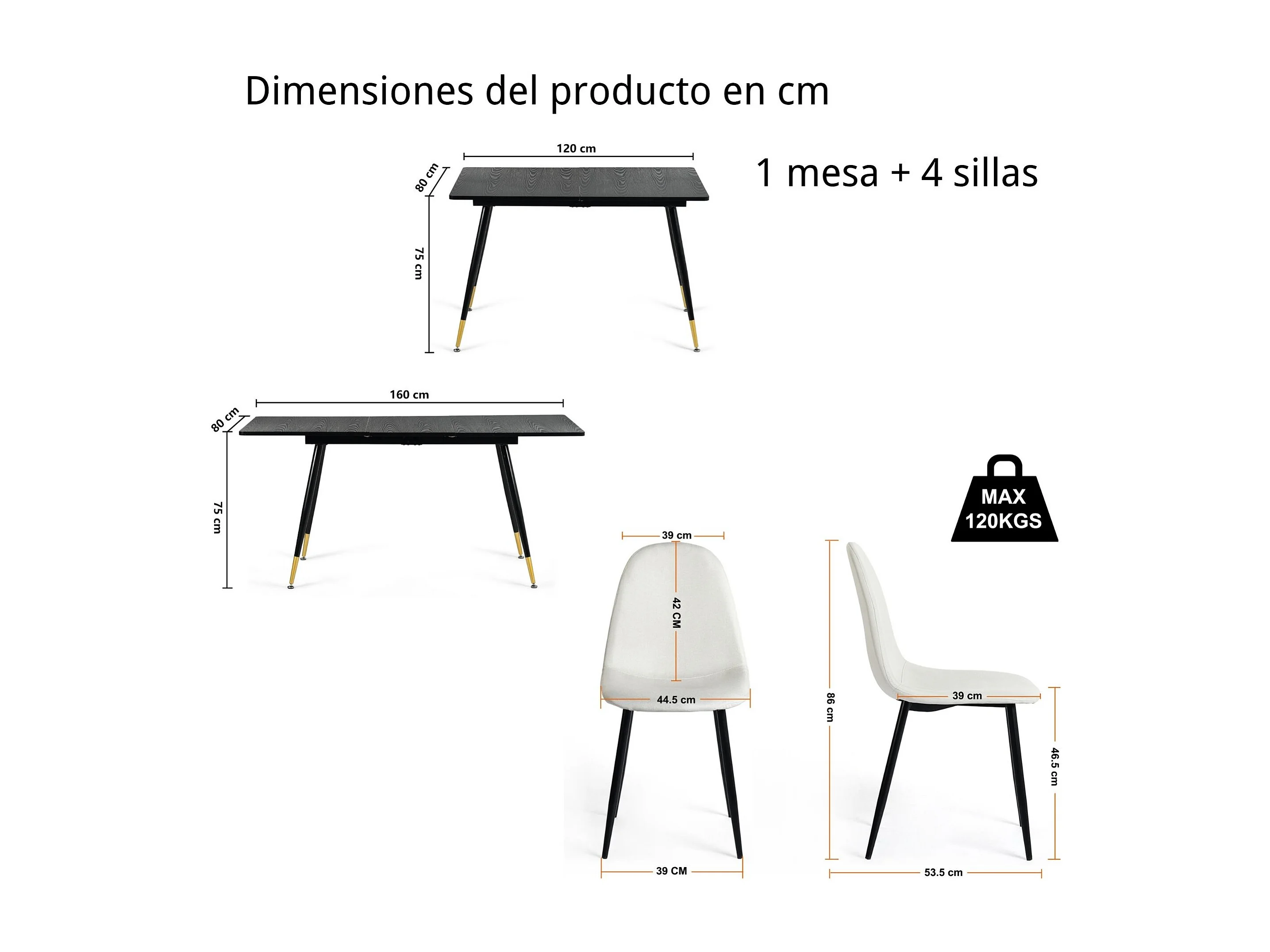 URBAN MEUBLE Ensemble table extensible noir 120-160 et 4 chaises style scandinaves blanches cassées