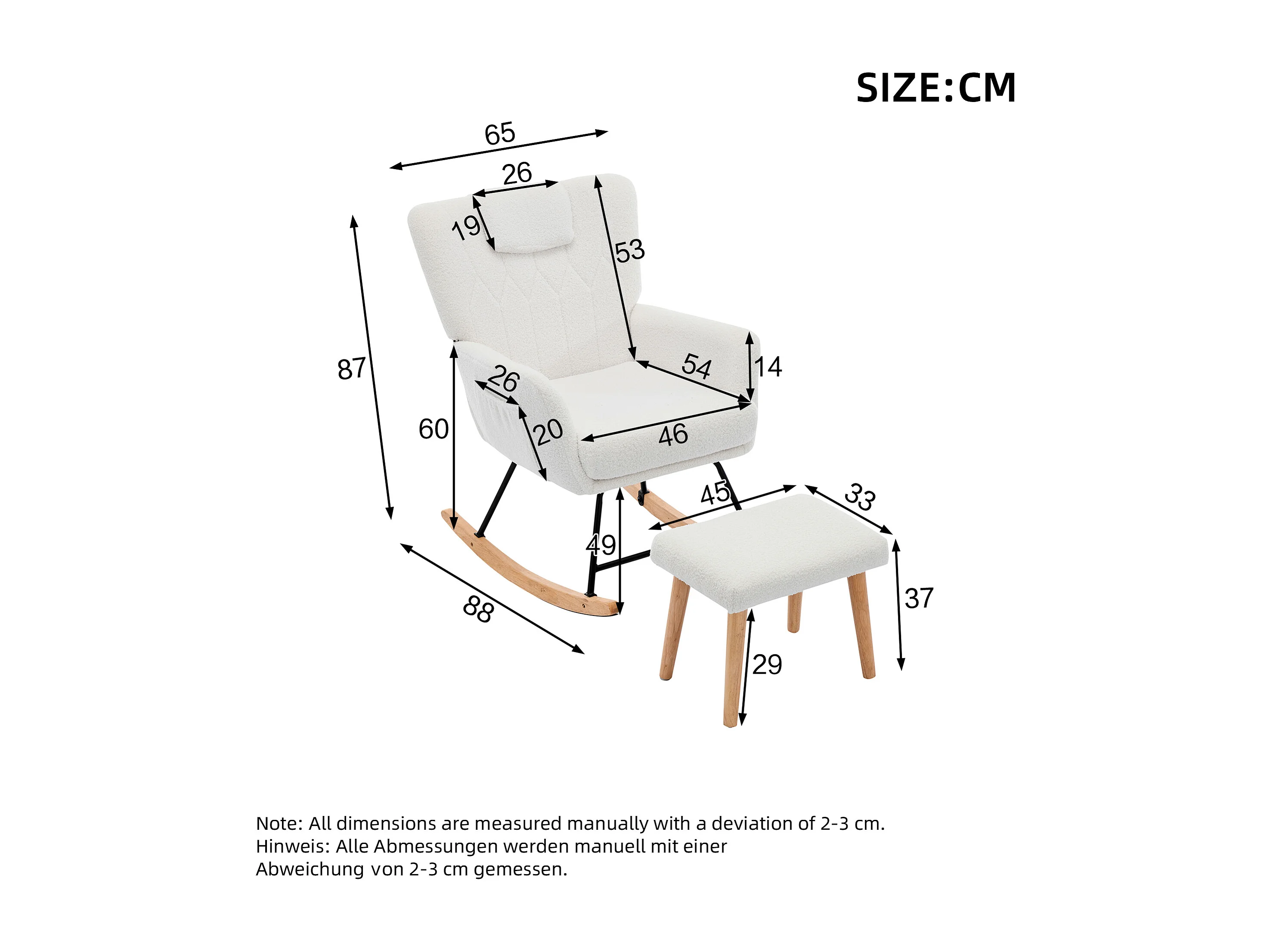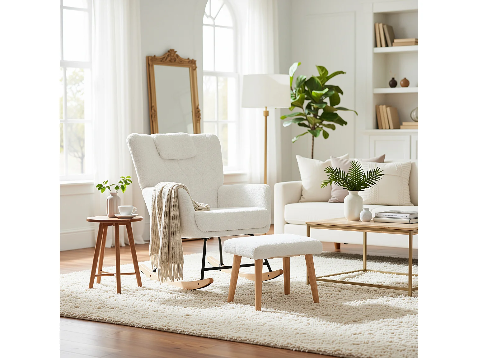 URBAN MEUBLE Fauteuil à bascule en tissu teddy blanc avec coussin de nuque et repose-pieds inclus