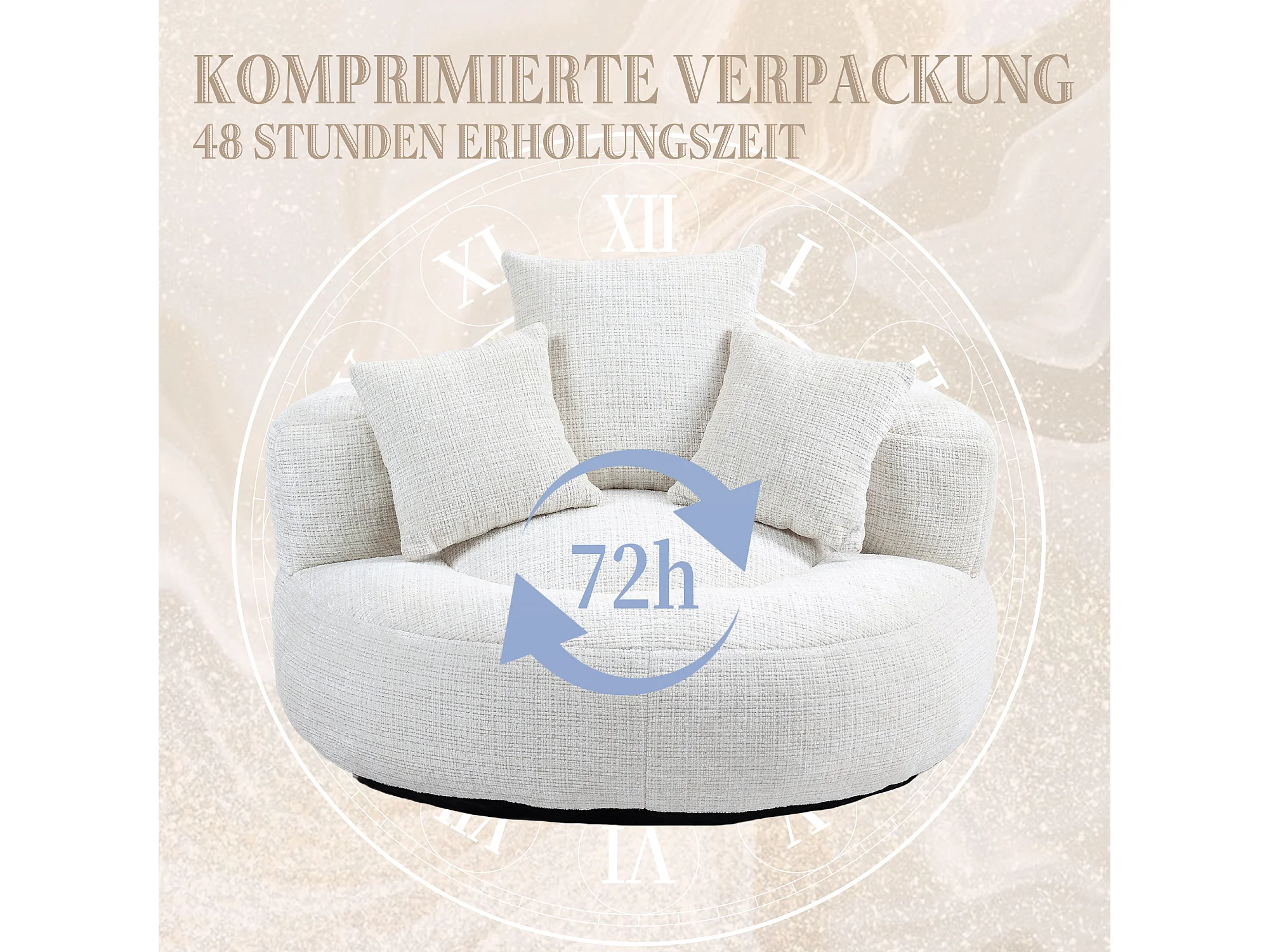 URBAN MEUBLE Grand fauteuil rond en chenille beige chaise lounge avec trois coussins
