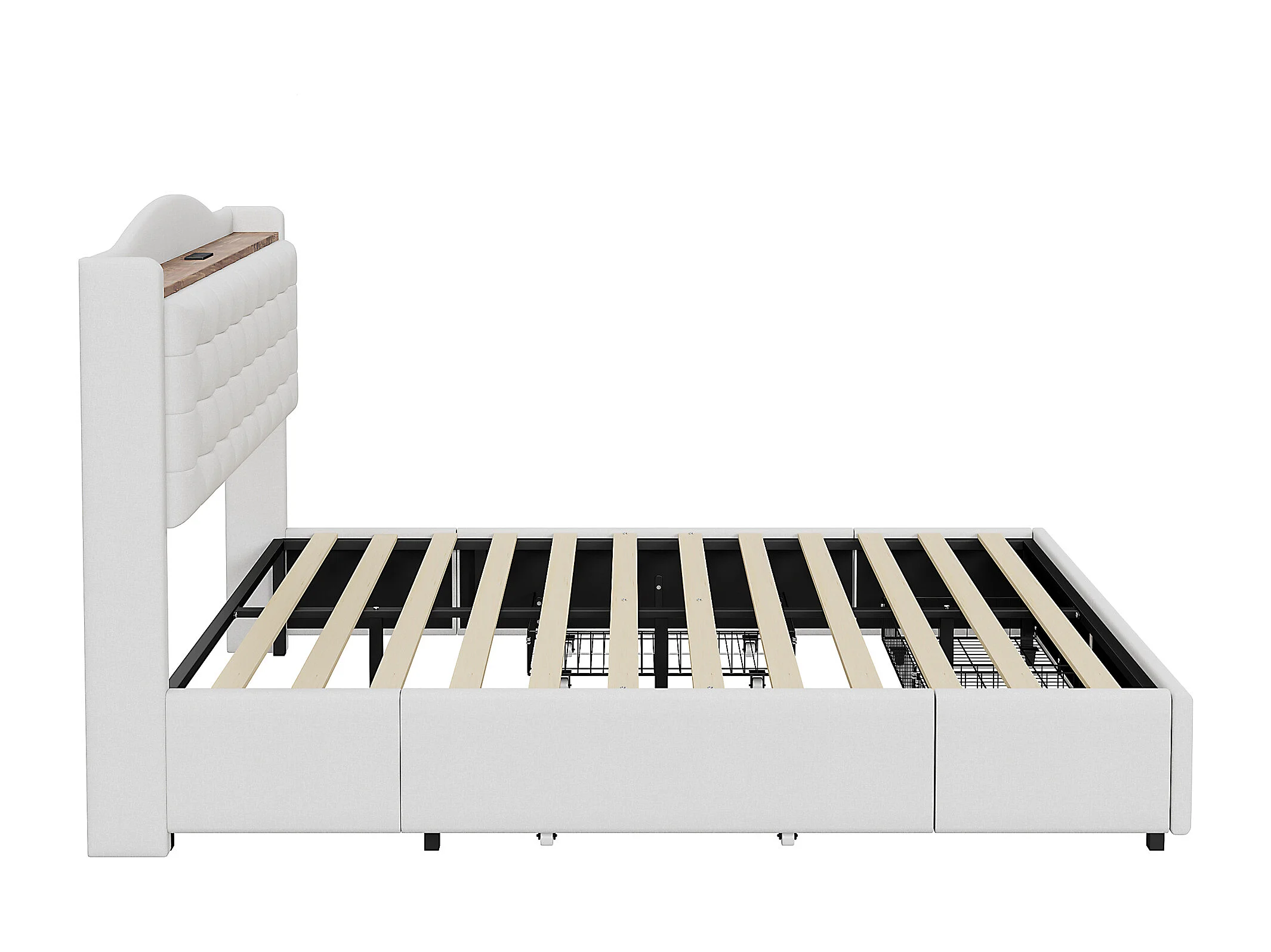 URBAN MEUBLE Lit king lin beige rembourré 4 tiroirs avec 2 prises USB (160*200 cm)