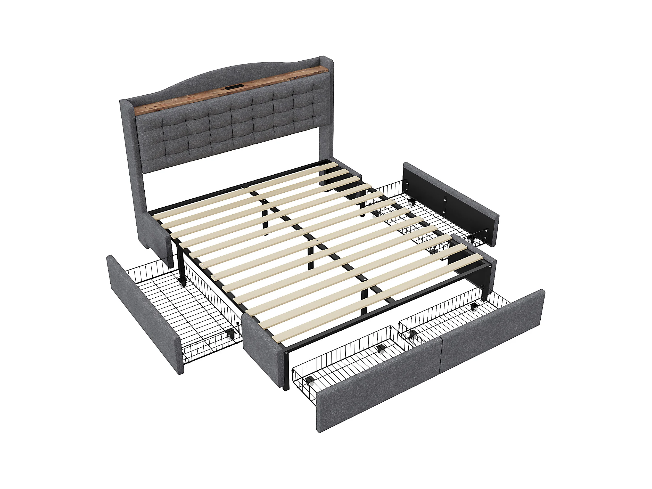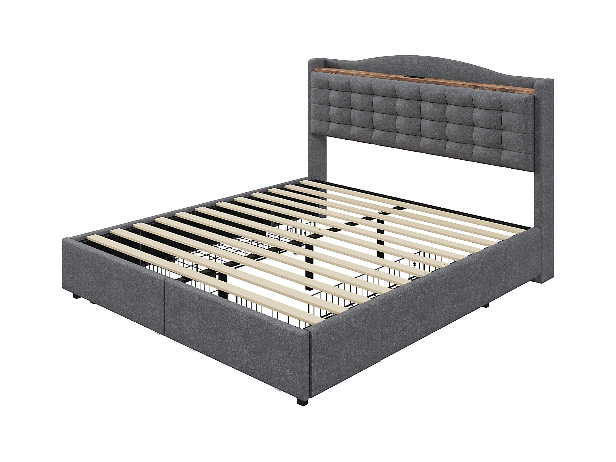 URBAN MEUBLE Lit king lin gris rembourré 4 tiroirs avec 2 prises USB (160*200 cm)