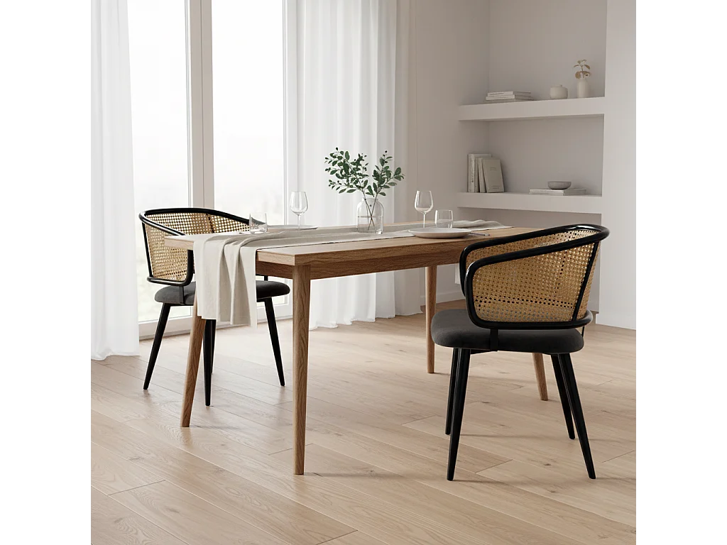 URBAN MEUBLE Lot de 2 chaises de salle à manger velours gris et dossier en rotin, pieds en métal noir