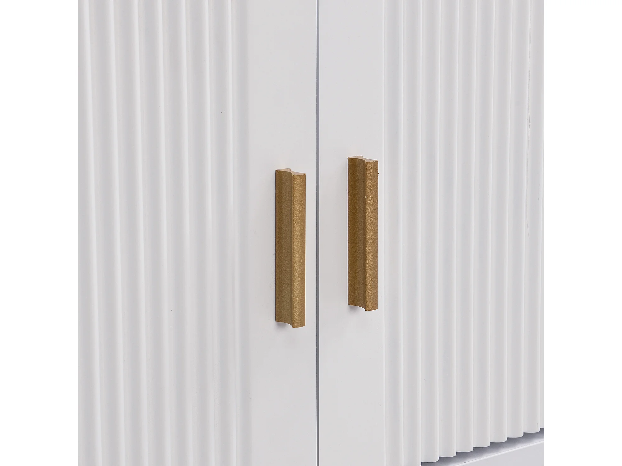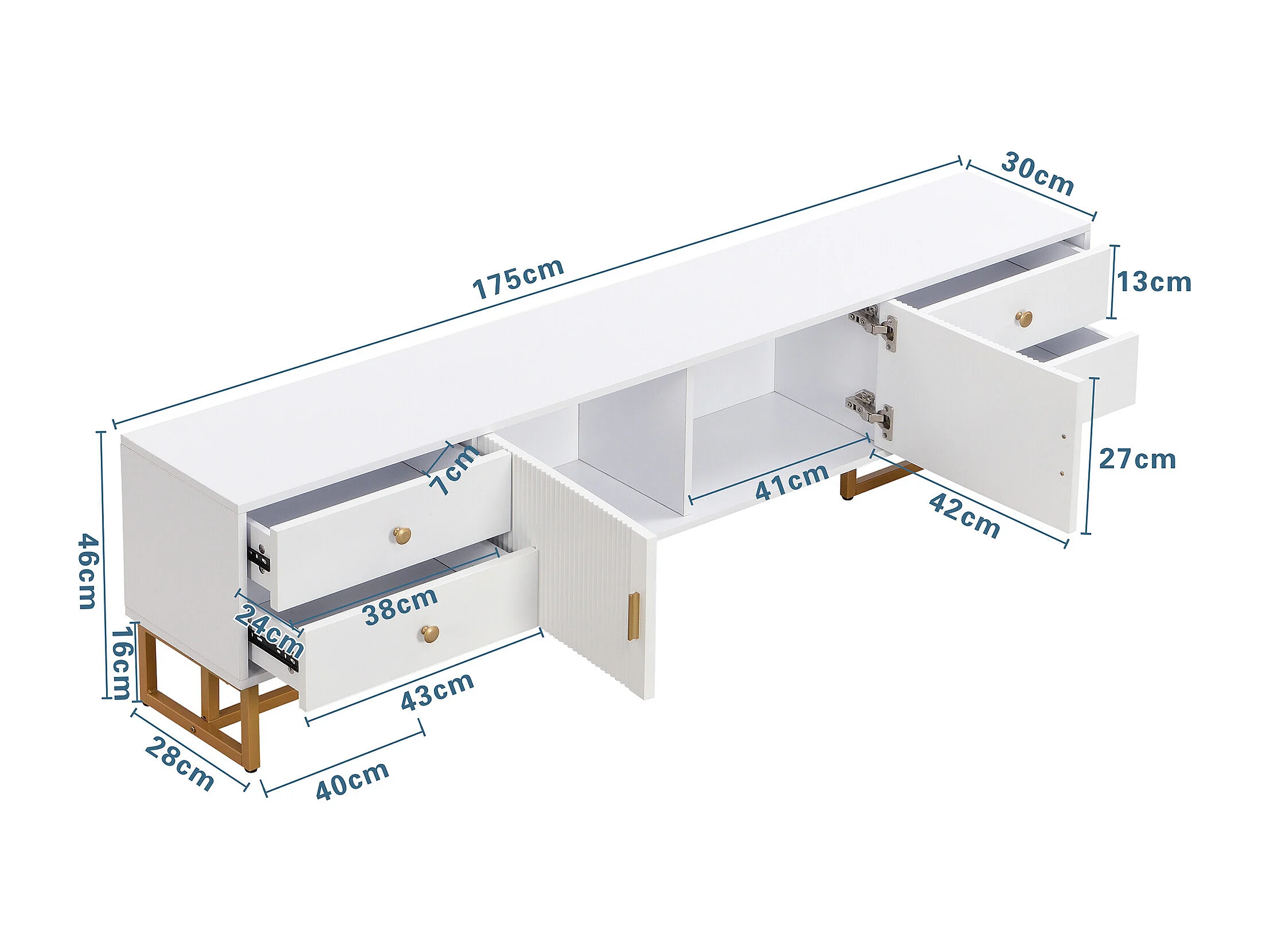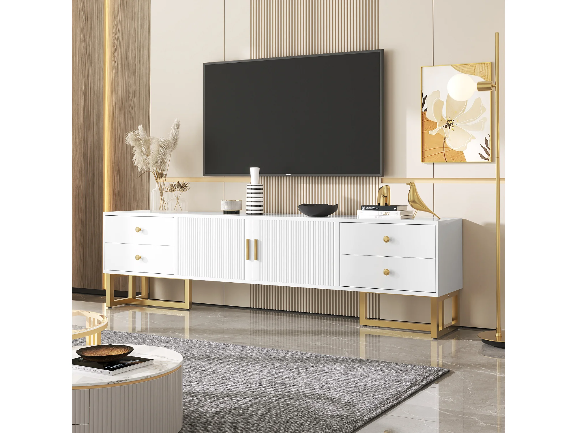 URBAN MEUBLE Meuble TV blanc avec 4 tiroirs, 2 portes texturés et accents dorés