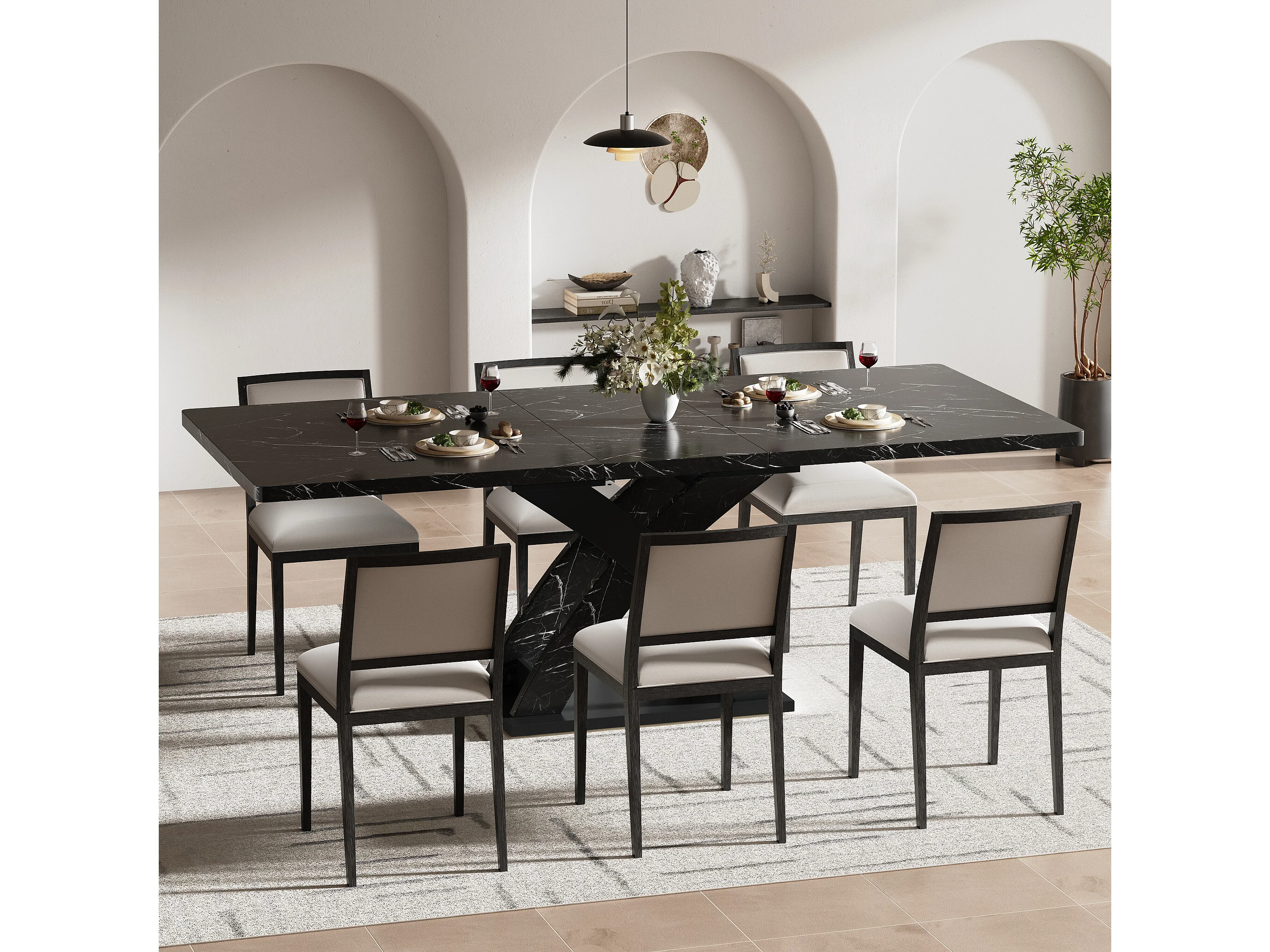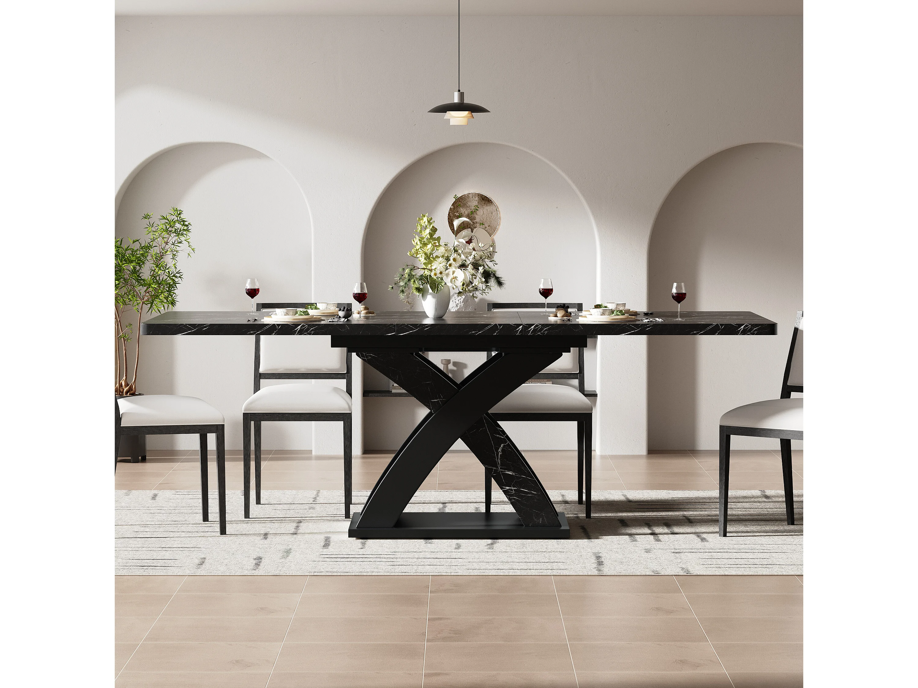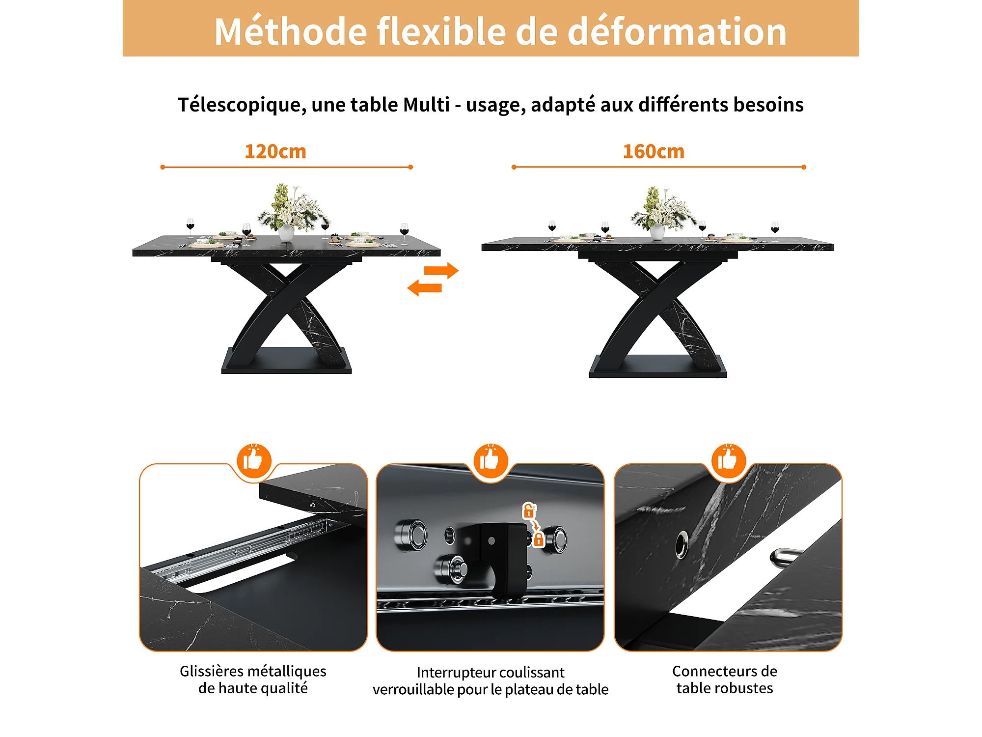 URBAN MEUBLE Table à manger extensible effet marbre noire 120-160cm pieds croisés