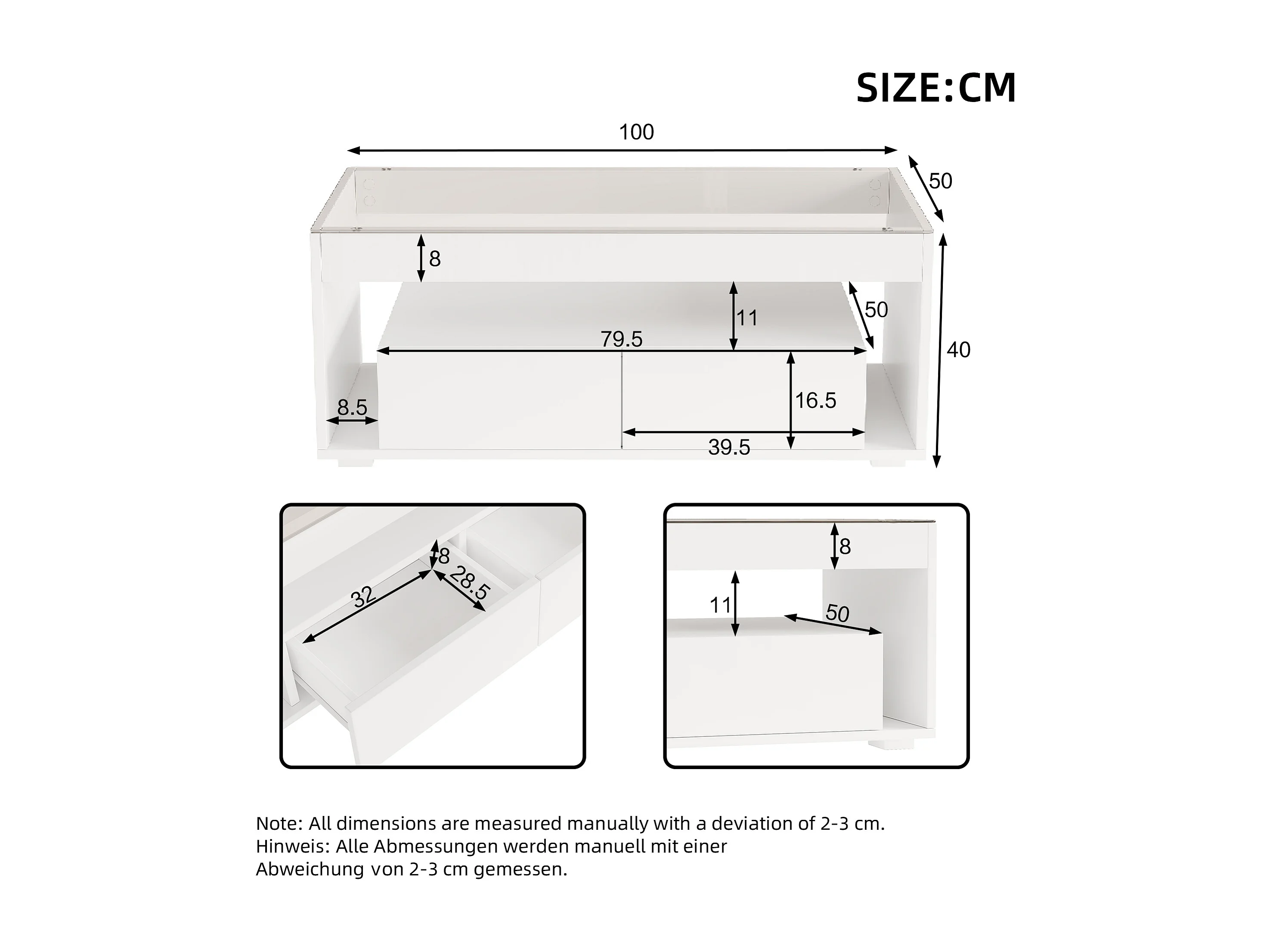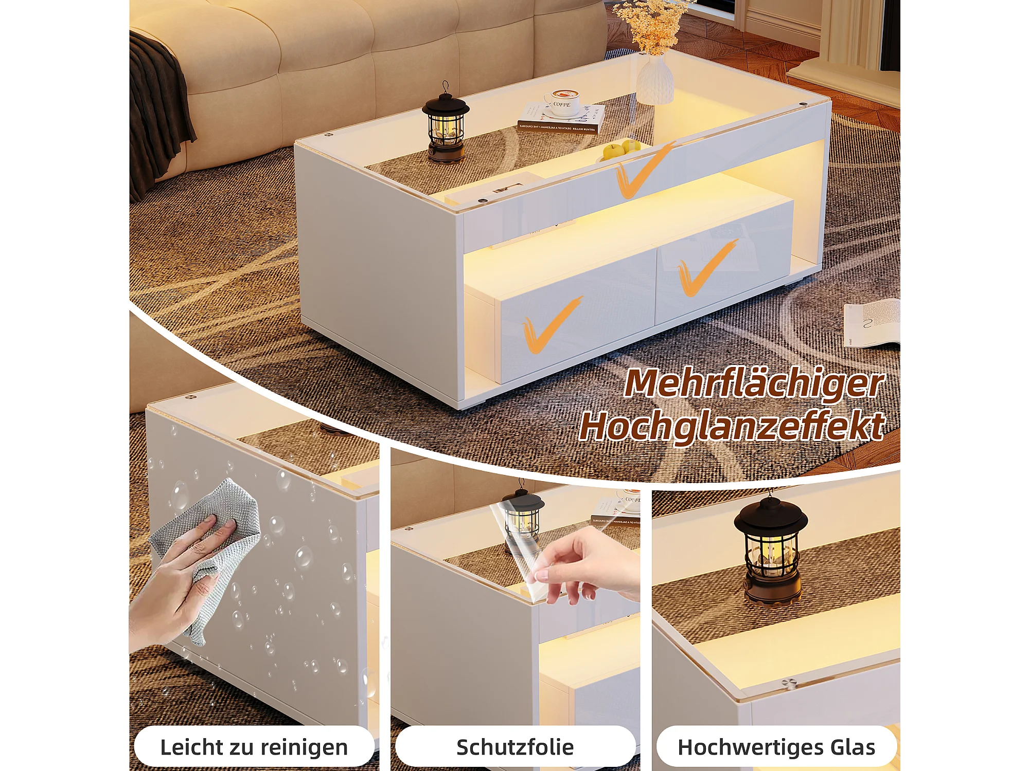 URBAN MEUBLE Table basse blanche en verre 2 tiroirs avec éclairage LED 100x50cm
