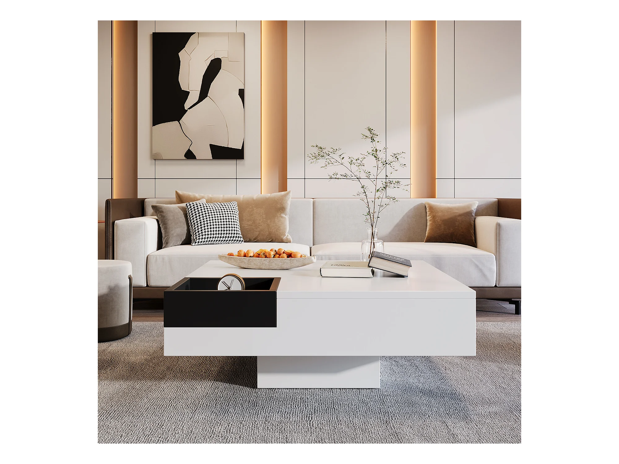 URBAN MEUBLE Table basse carrée blanc brillant noir bicolore éclairage LED avec boîte de rangement amovible