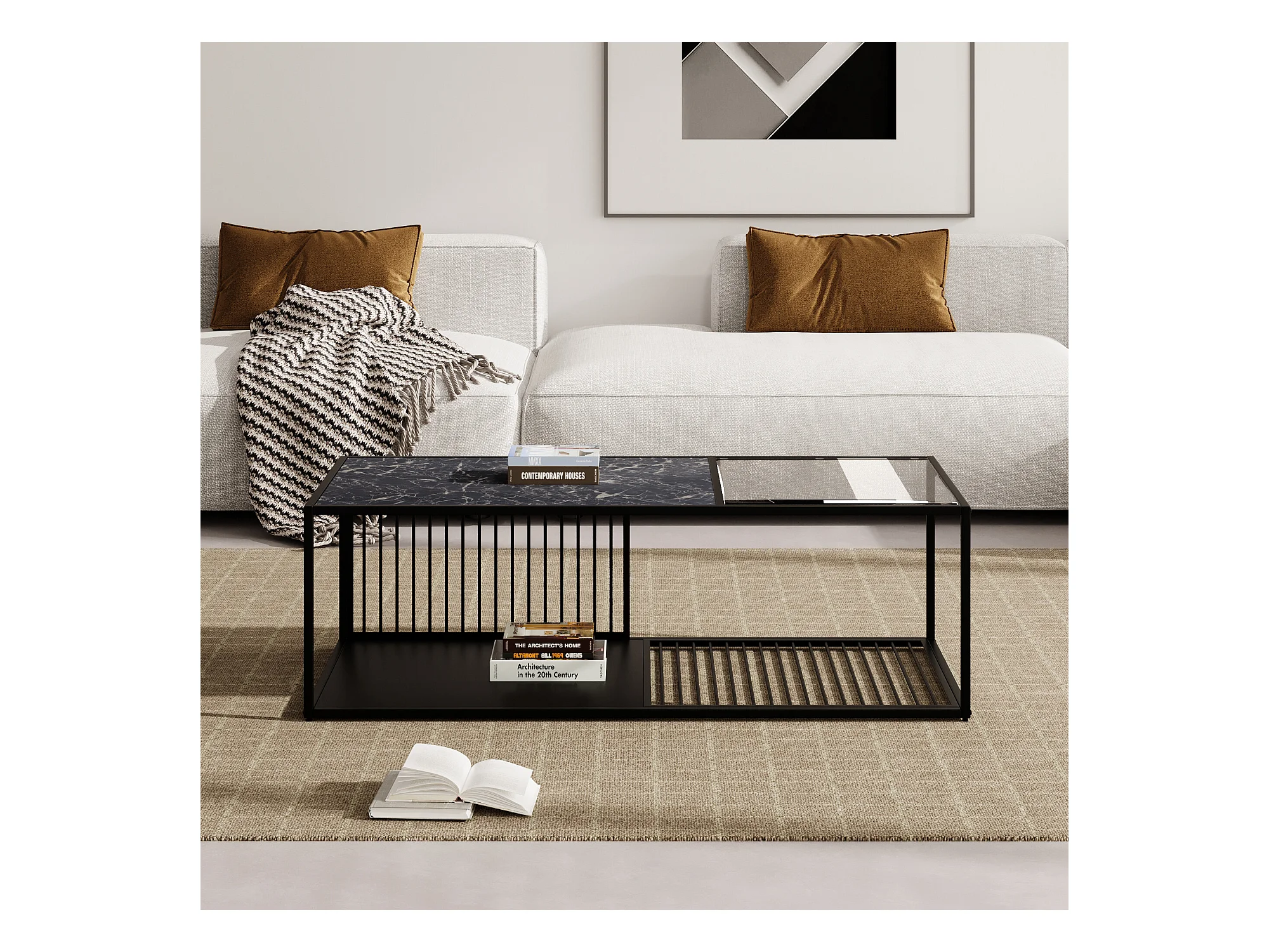 URBAN MEUBLE Table basse en fer forgé avec verre et effet marbré noir 110*48*35cm
