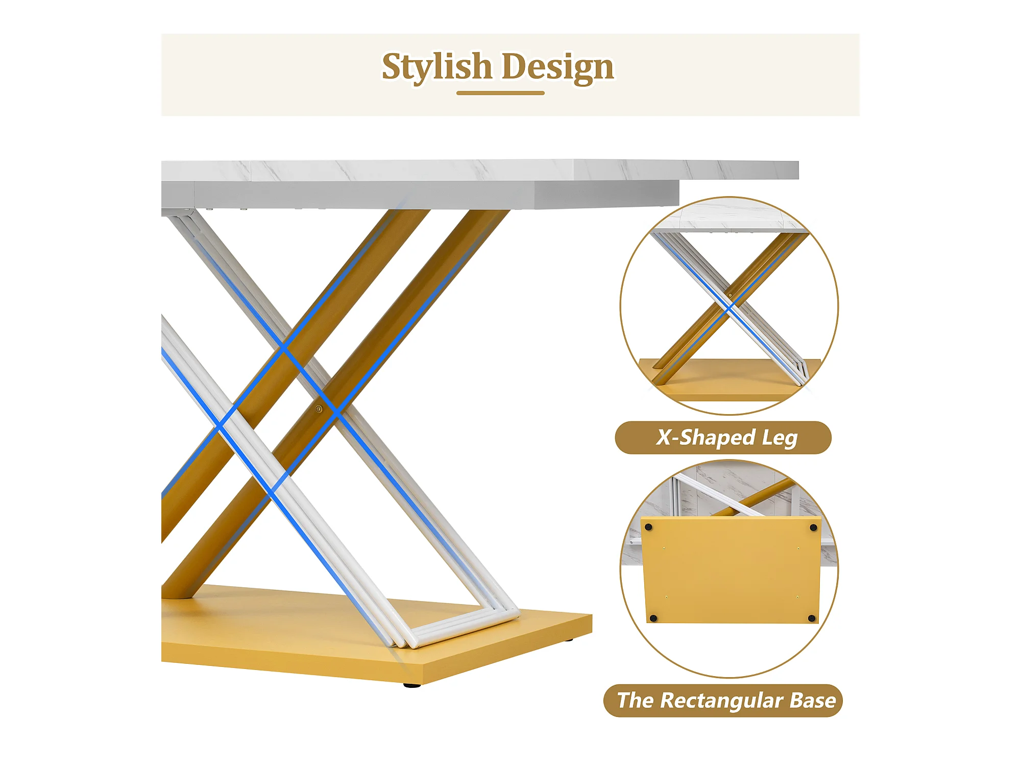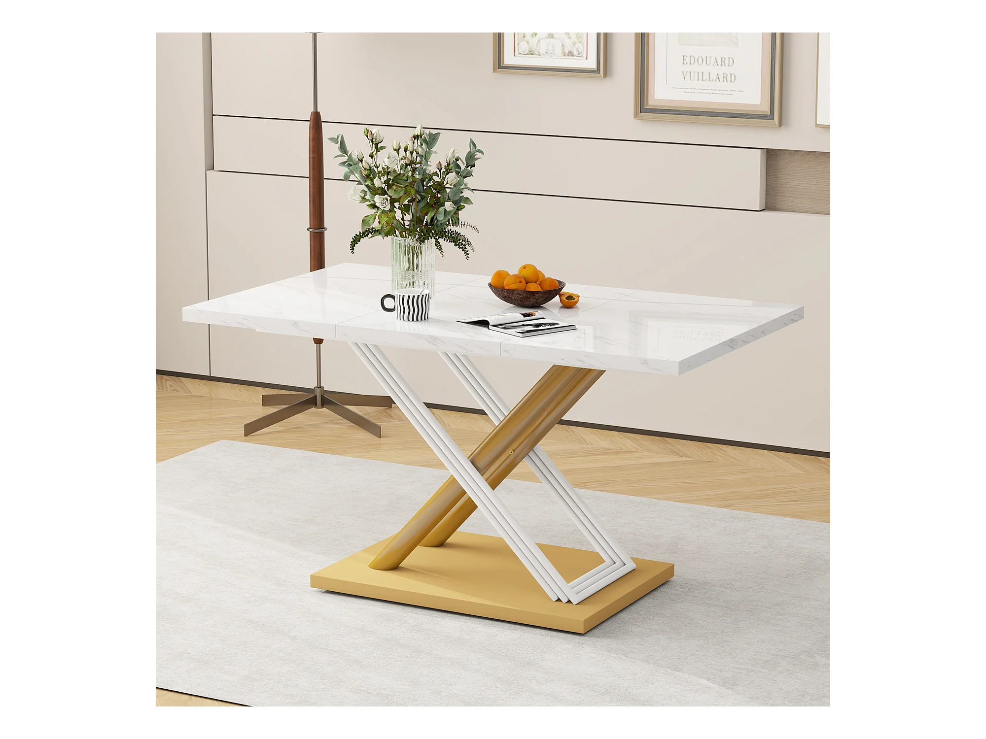 URBAN MEUBLE Table de salle à manger effet marbre blanc pieds X formes dorés 140*80cm