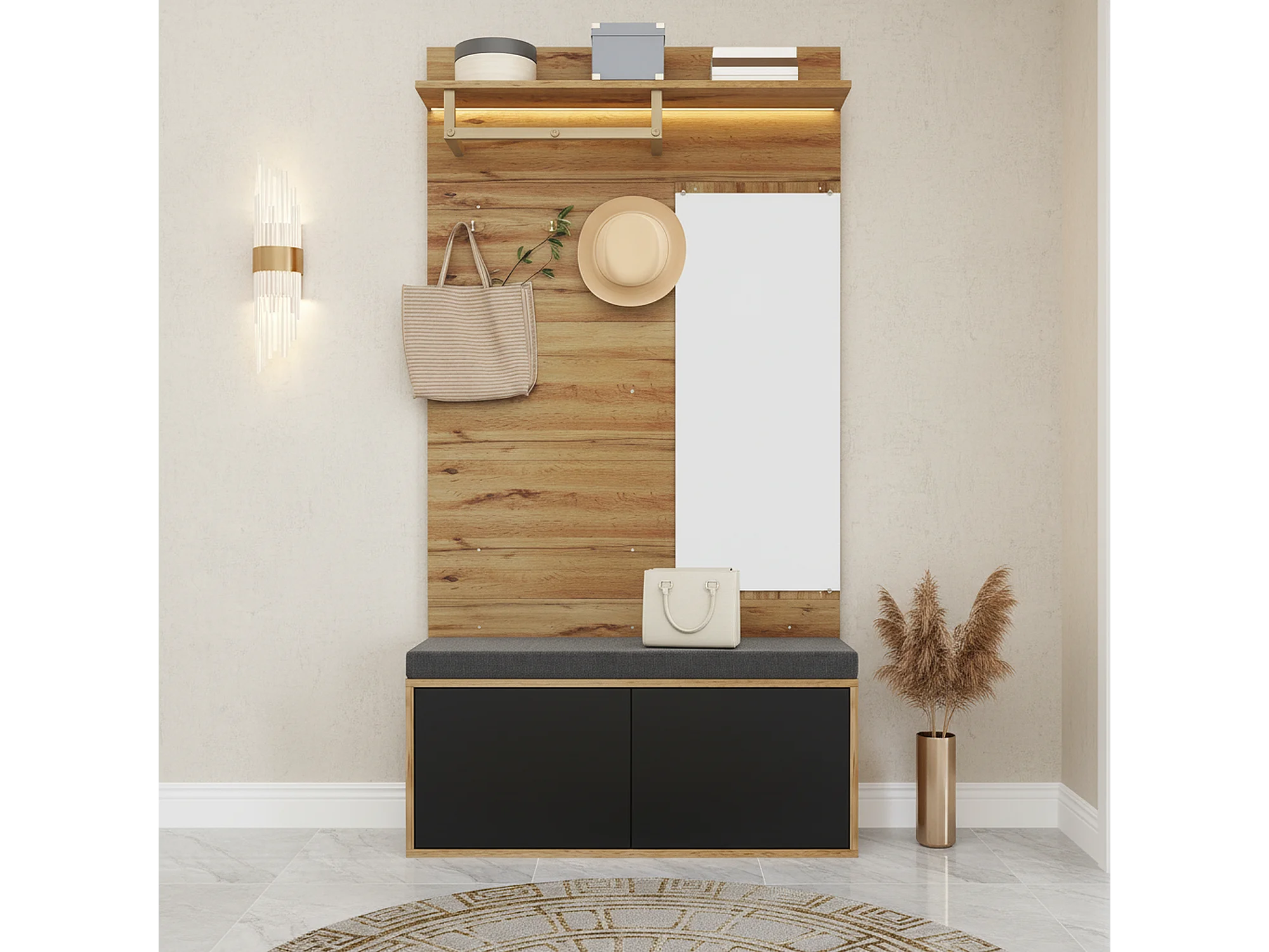 URBAN MEUBLE Vestiaire à l'entrée effet bois banc rembourré, miroir, porte-manteaux, miroir et rangement chaussures
