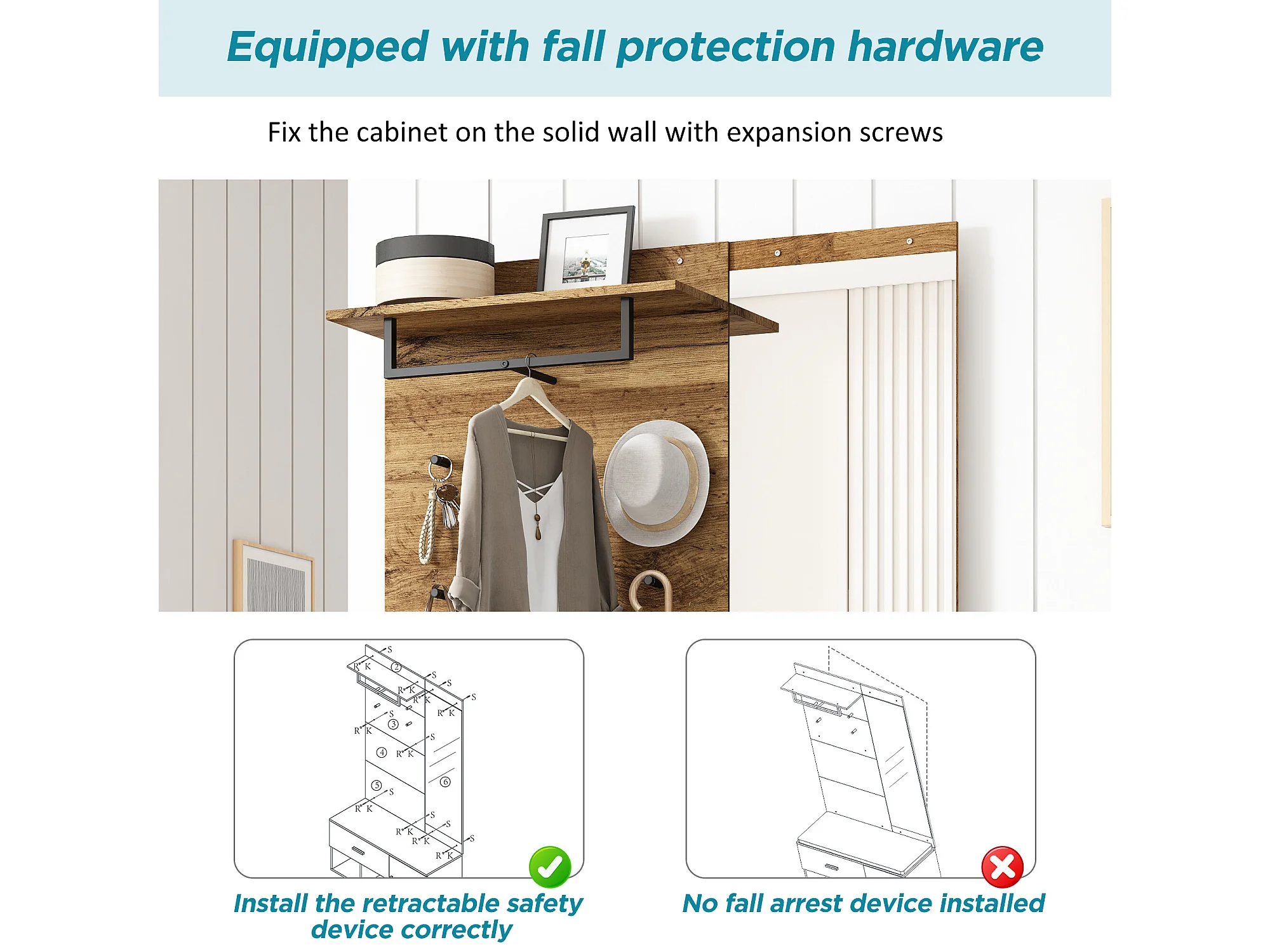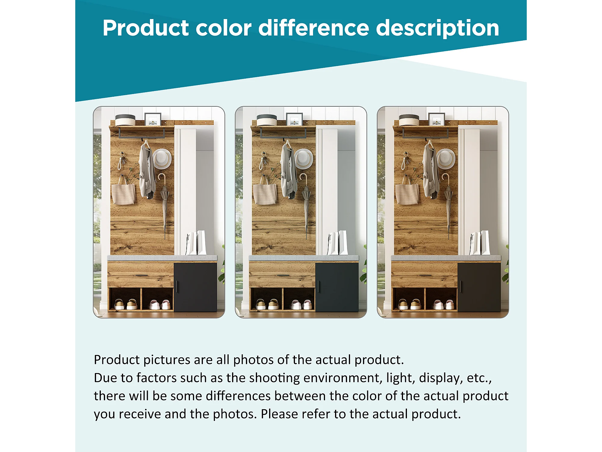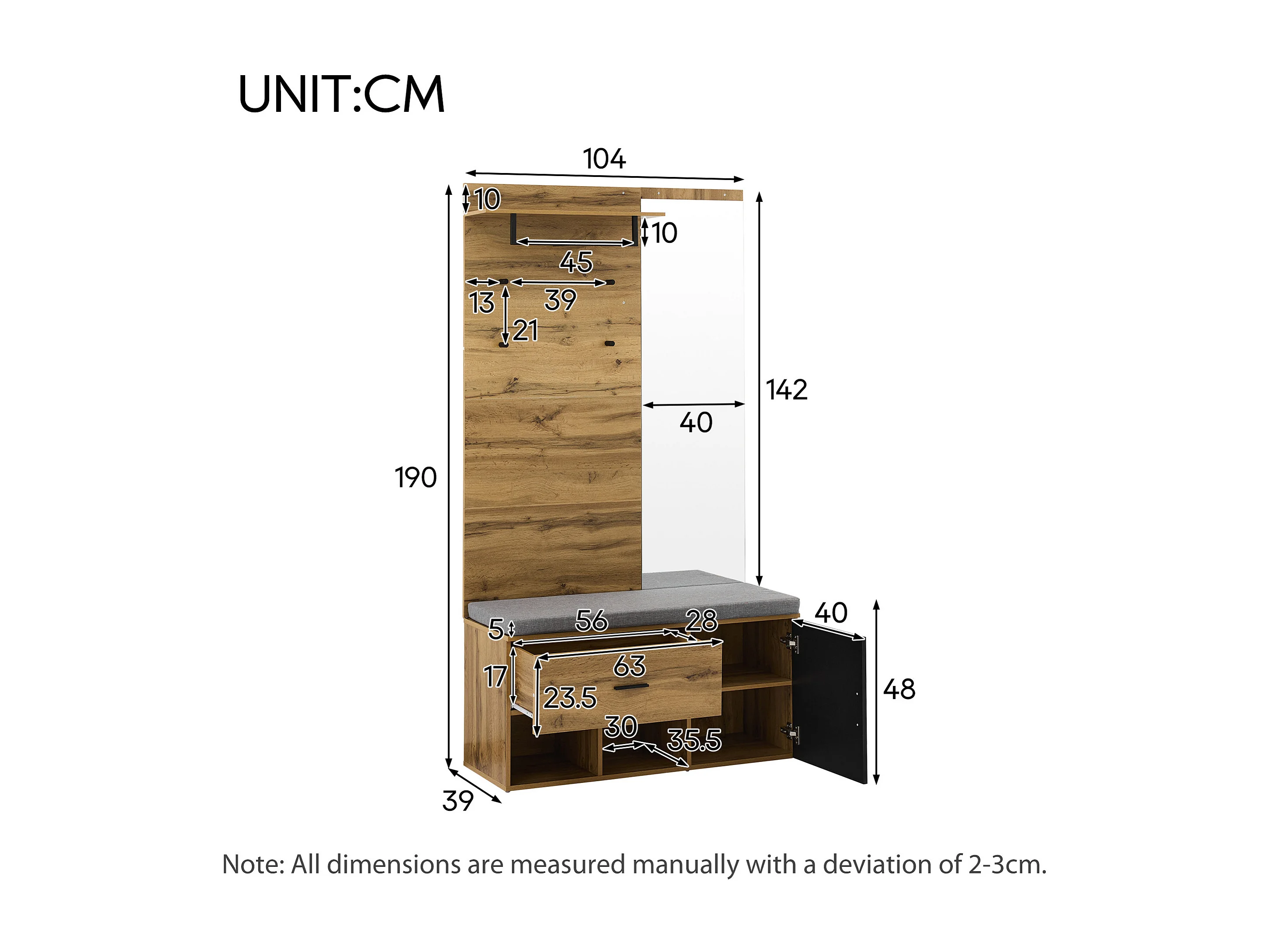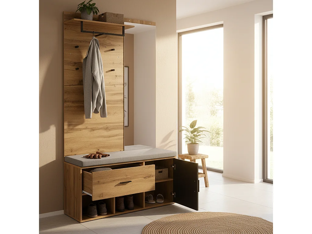 URBAN MEUBLE Vestiaires à l'entrée complet effet chêne avec miroir, banc rembourré gris, meuble à chaussures