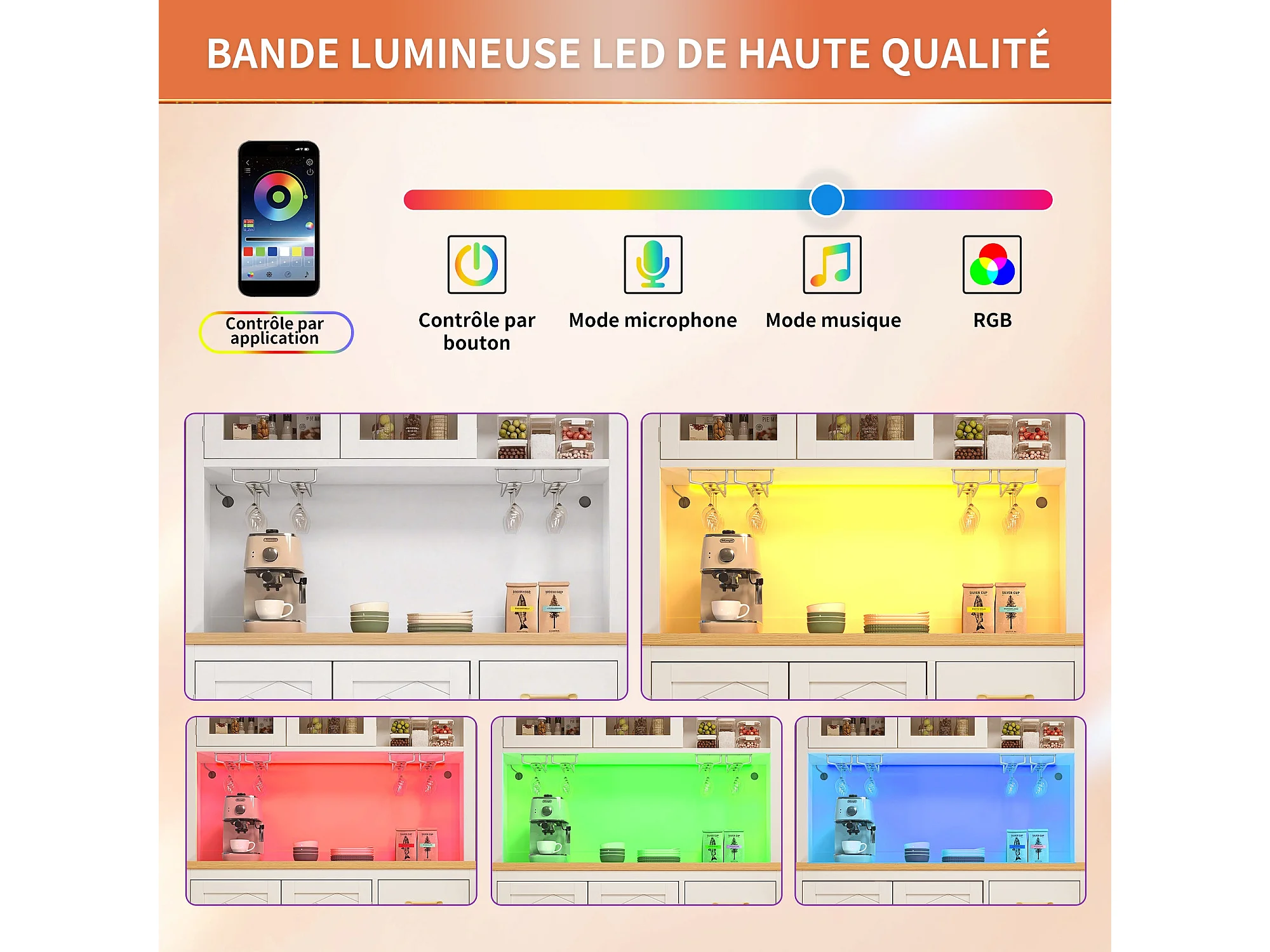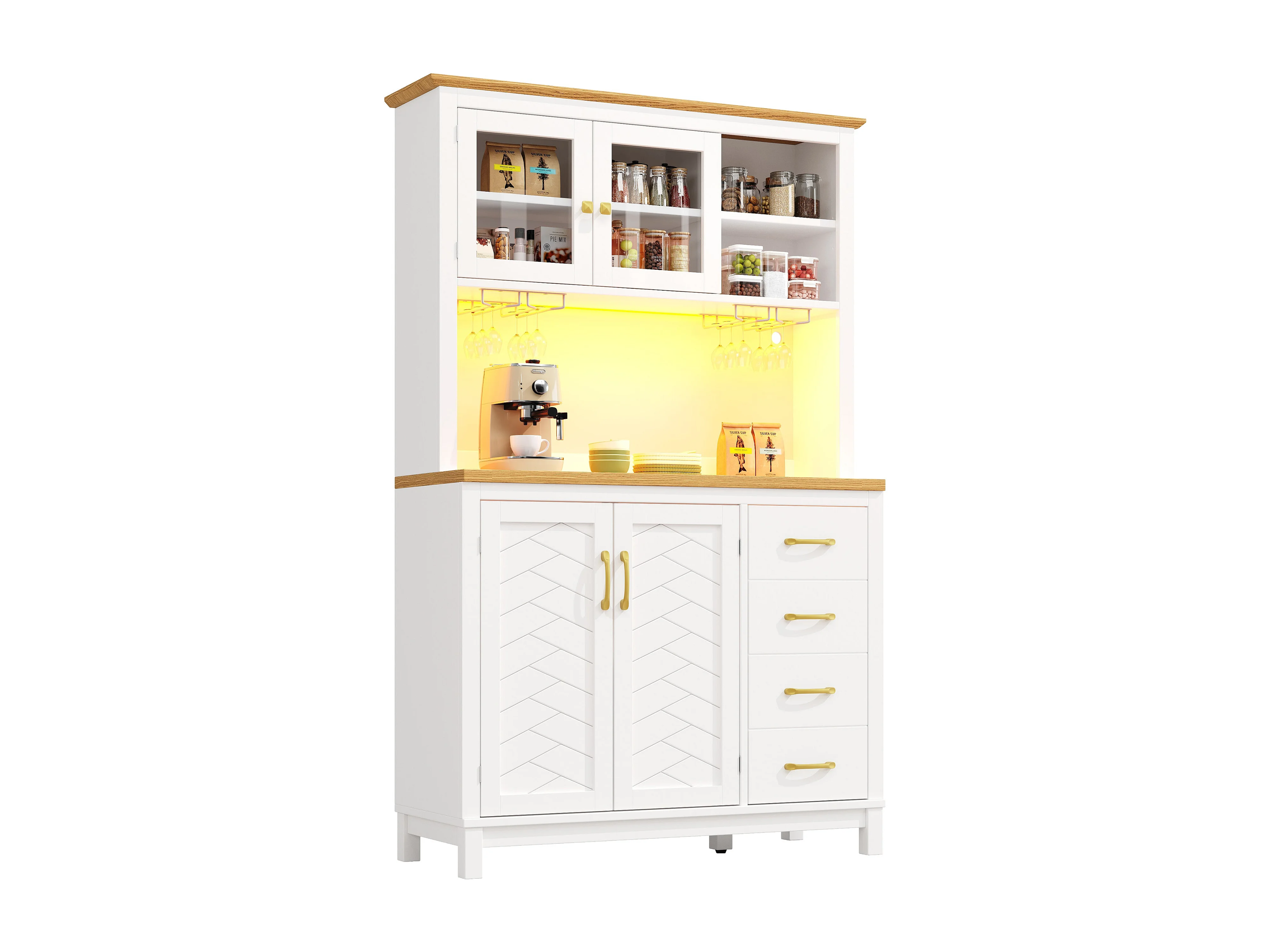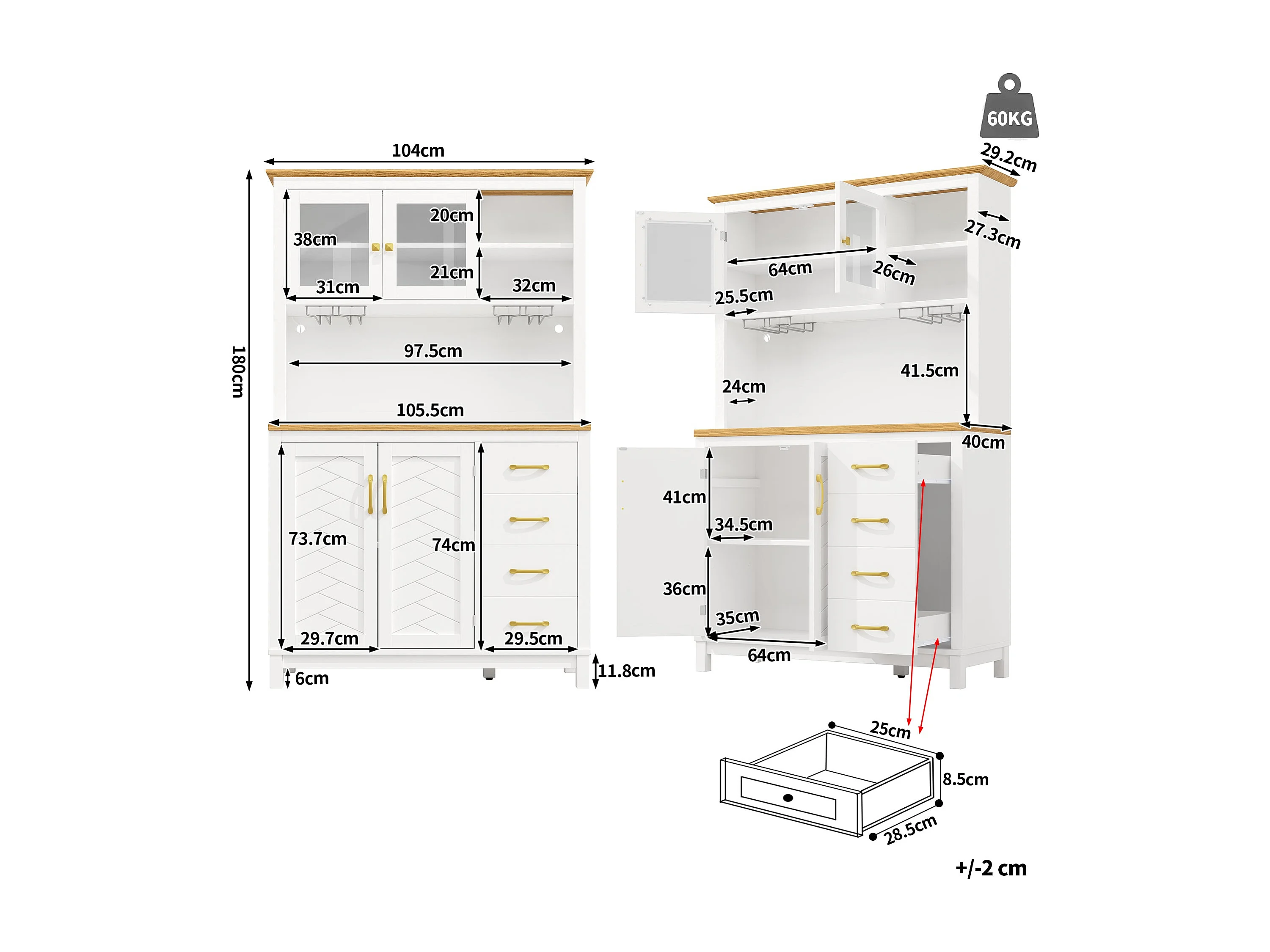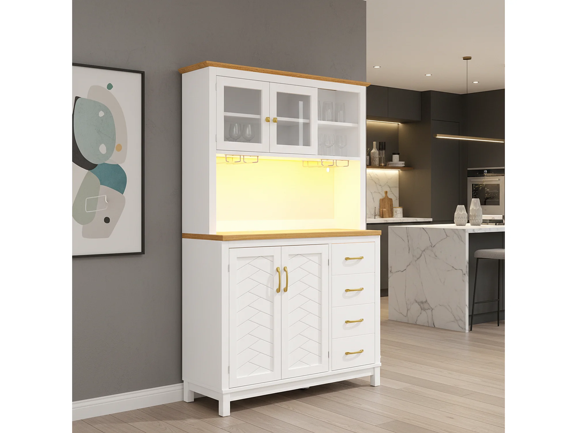 Vaisselier de cuisine effet bois et blanc vitrine design chevrons avec éclairage LED 105,5x40x180cm