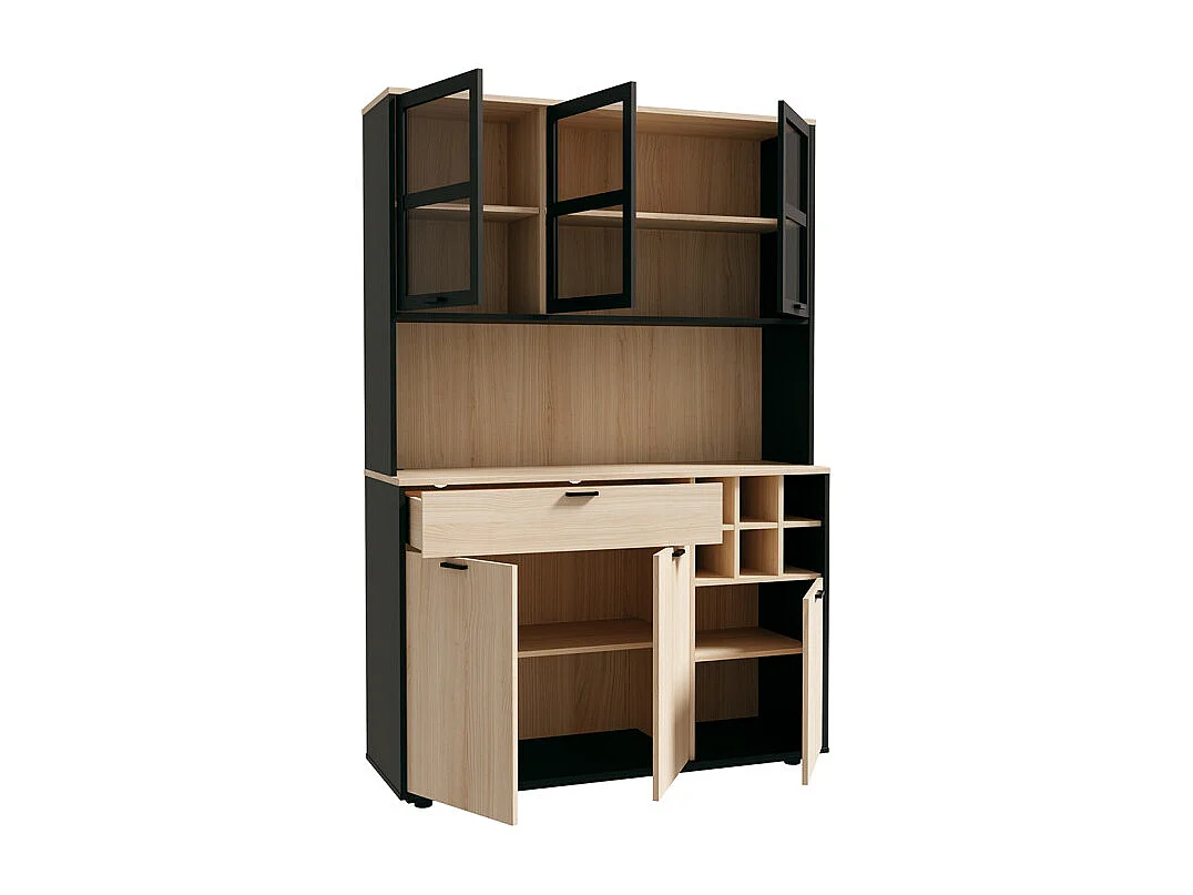 Vaisselier portes vitrées et tiroir décor bois clair et éclairage LED - KEMA