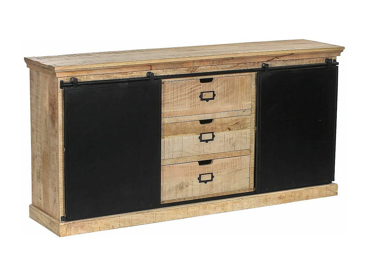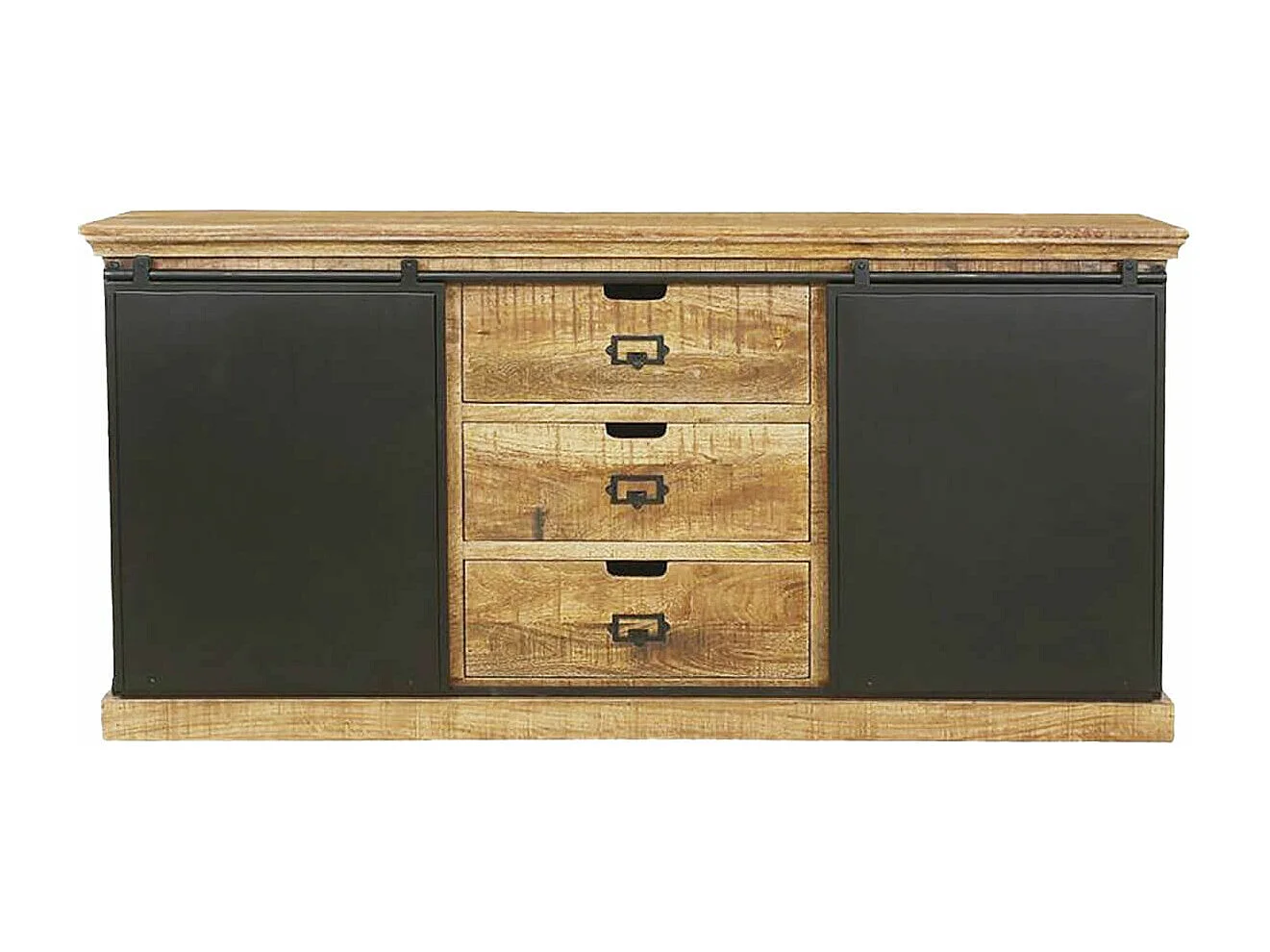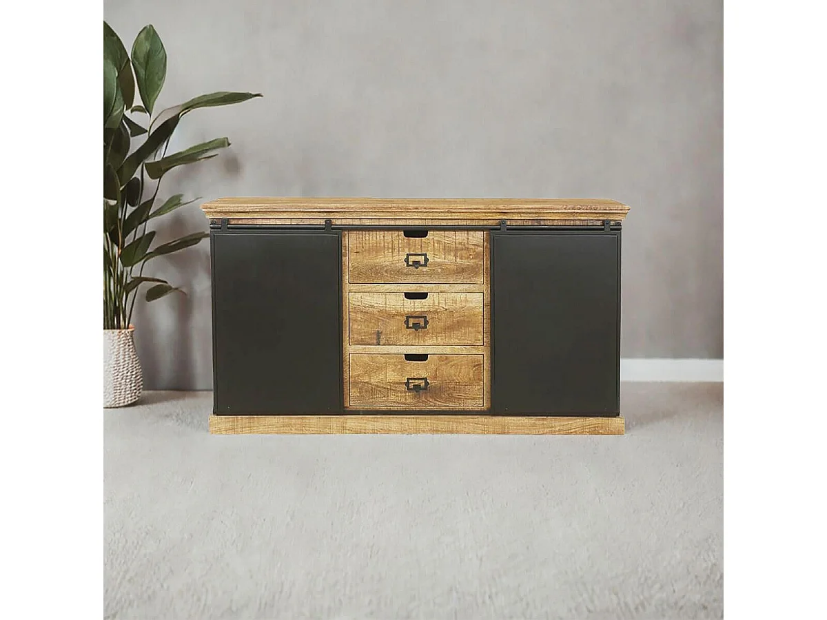 VALMON - Bahut en Manguier 3 Tiroirs et 2 Portes Coulissantes en Métal Laqué Noir