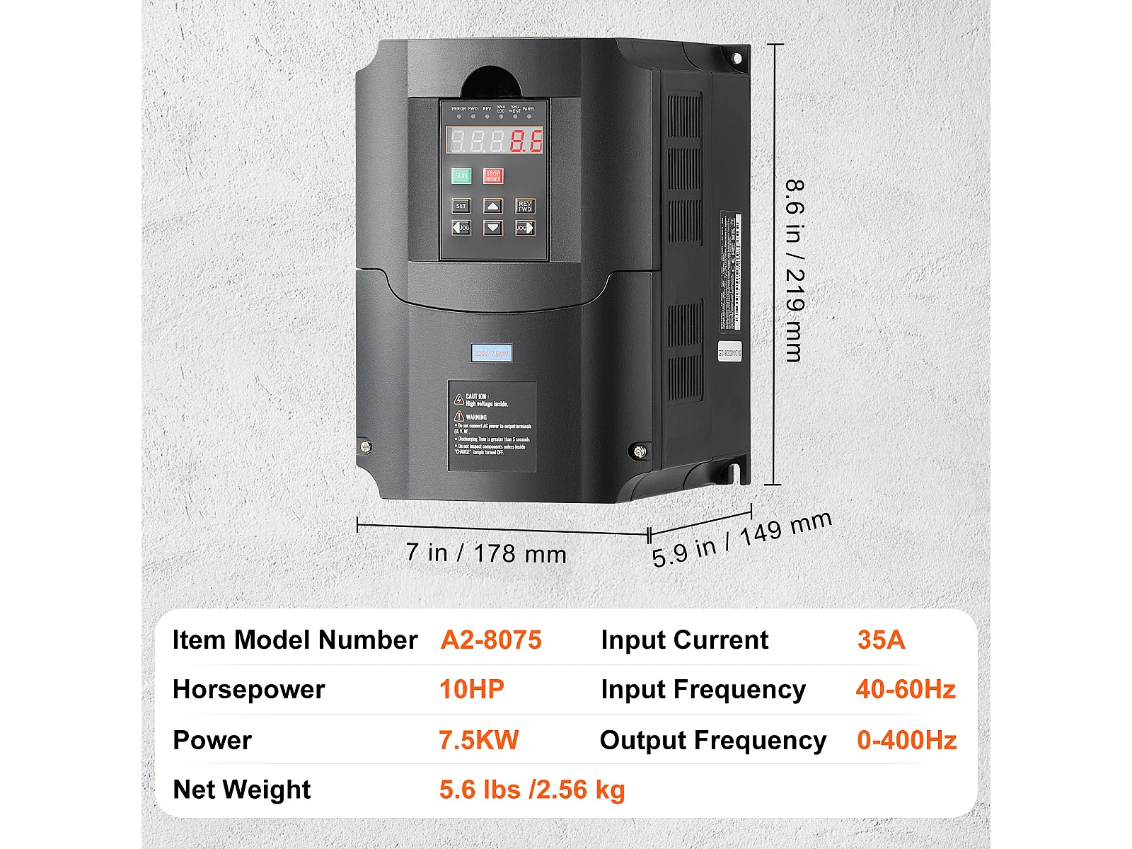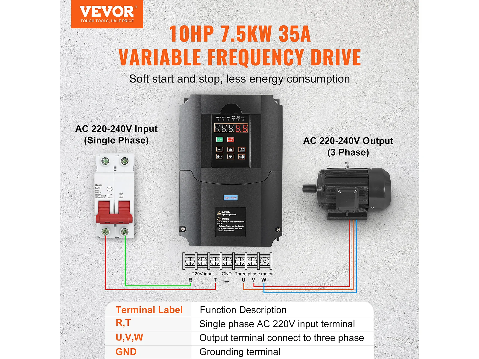 Variateur de Fréquence SucceBuy 10HP, 7,5KW, 35A 220V VFD, Entrée 1/3 Phase vers Sortie 3 Phases, 0-400Hz