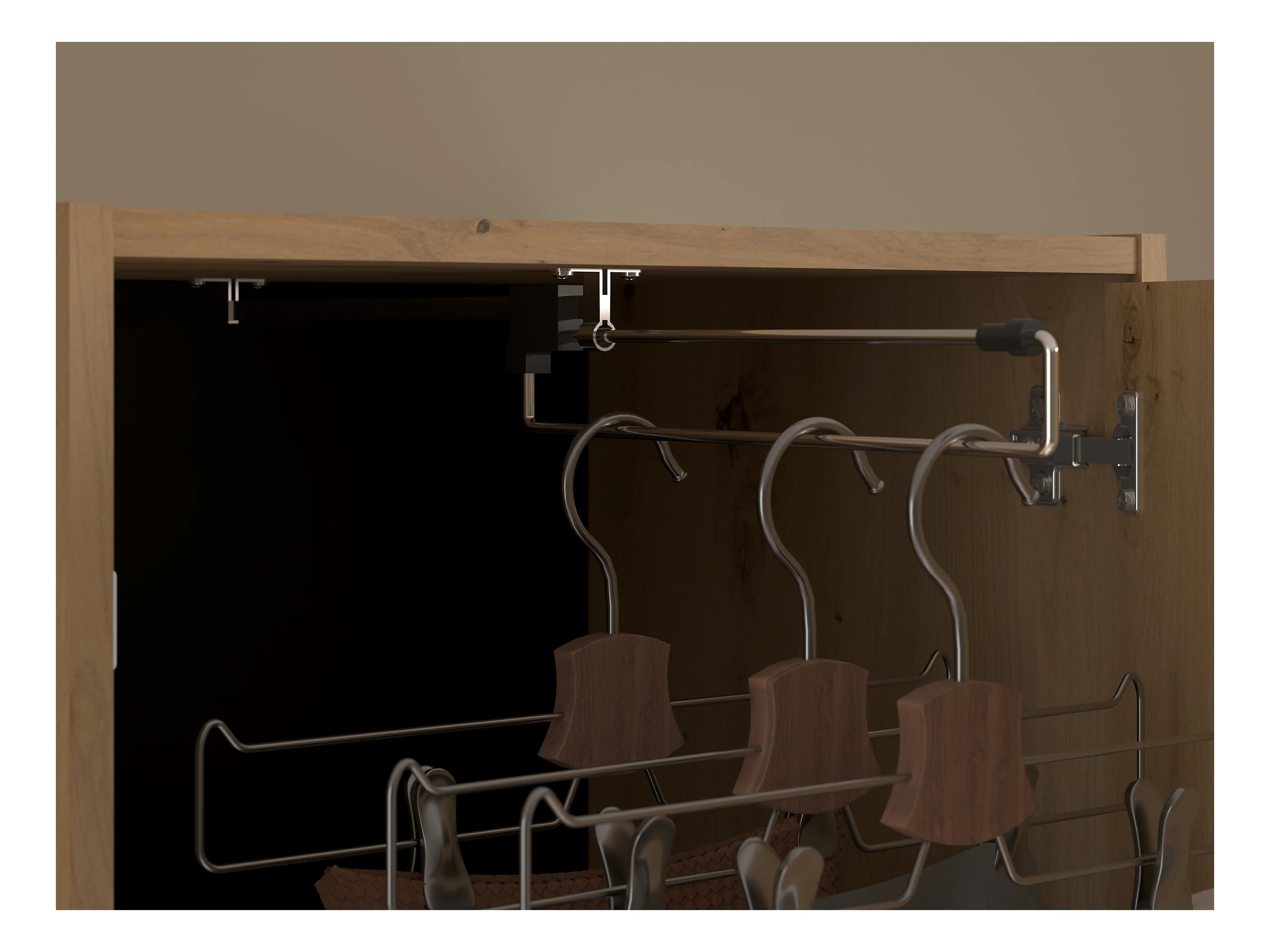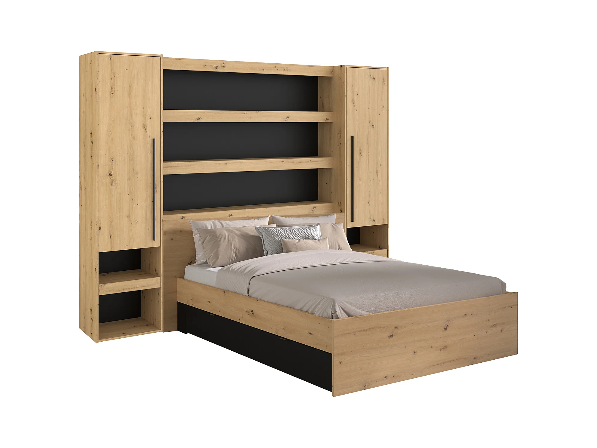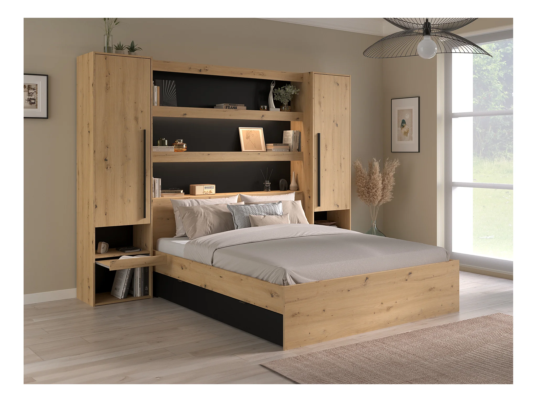 Lit pont 160 x 200 cm avec rangements - Avec LEDs - Coloris : Naturel et noir - VARLY