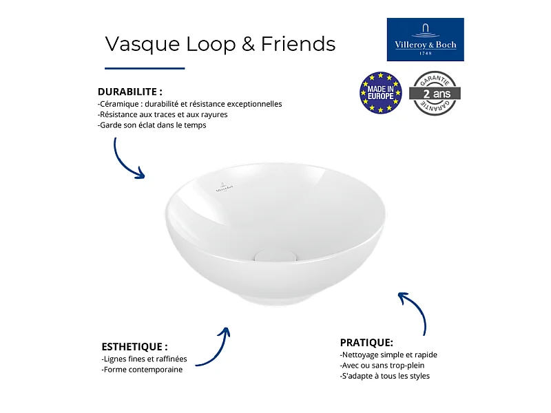 Vasque 42 x 42 ronde à poser VILLEROY ET BOCH Loop & Friends non meulé stone white avec trop plein