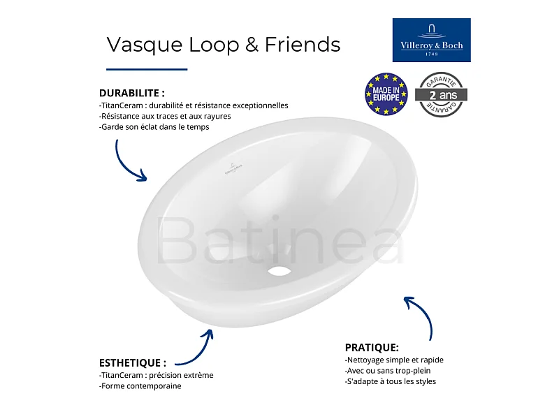 Vasque 50,5 x 36 ovale à poser VILLEROY ET BOCH Loop & Friends TitanCeram blanche avec trop plein