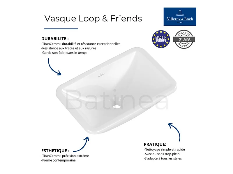 Vasque 67,5 x 45 rectangle à encastrer par dessous VILLEROY ET BOCH Loop & Friends TitanCeram stone white avec trop plein
