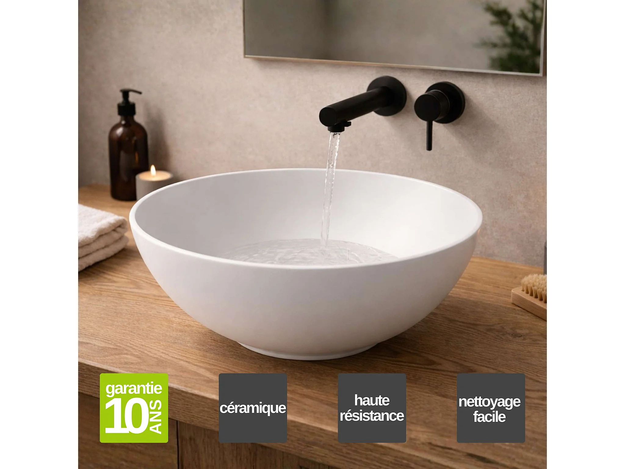 Vasque à poser ronde en céramique blanc mat D41cm, Profondeur 14,5cm - SANIZEO ATE.