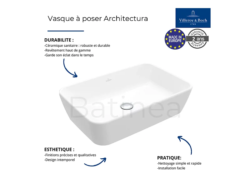 Vasque rectangle à poser VILLEROY ET BOCH Architectura 60 x 40,5 sans trop-plein