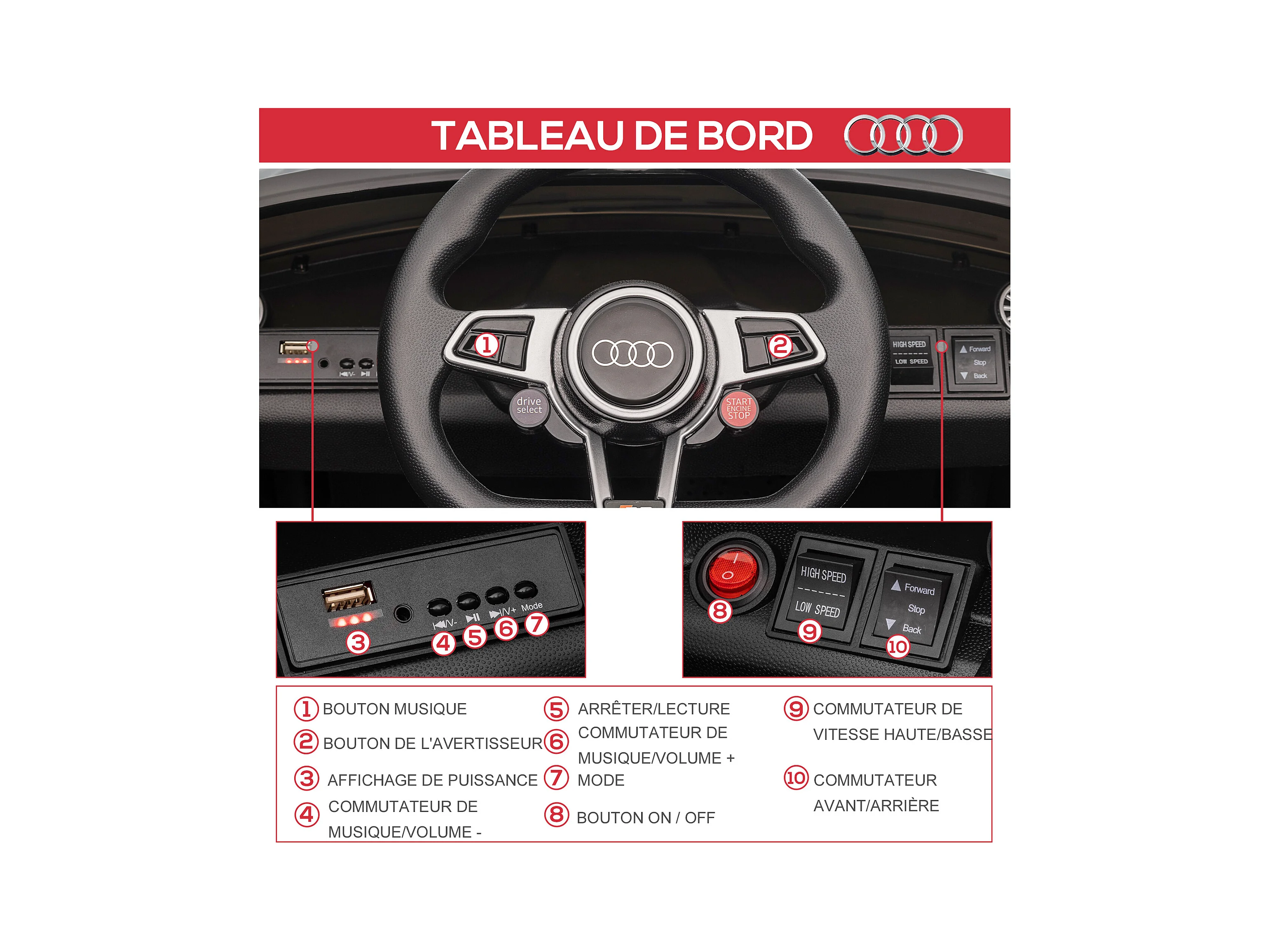 Véhicule électrique enfant TT RS 12 V 35 W V. max. 3 Km/h télécommande effets sonores + lumineux noir