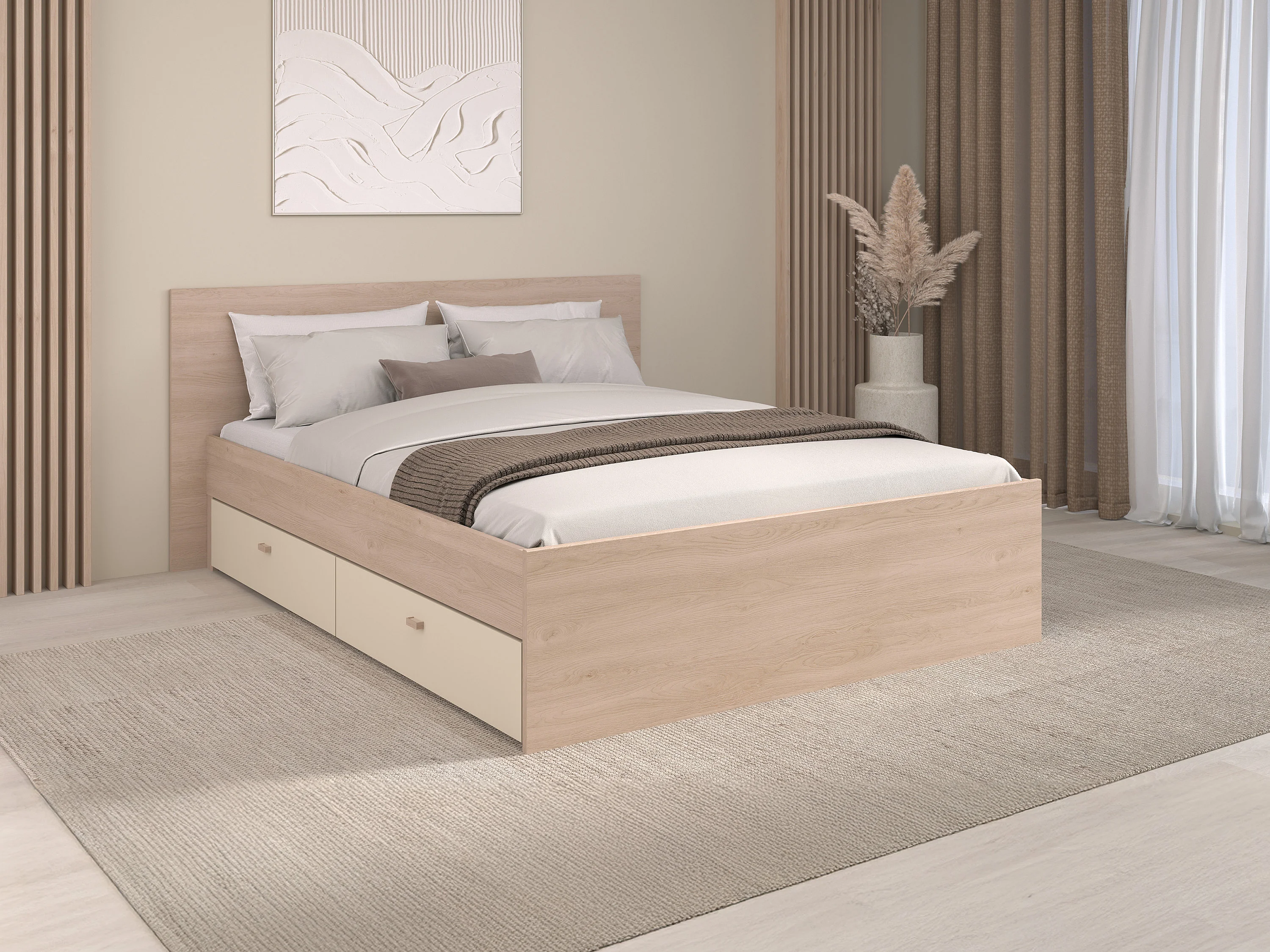 Lit avec 4 tiroirs 140 x 190 cm - coloris : Naturel et beige + Sommier - VELONA