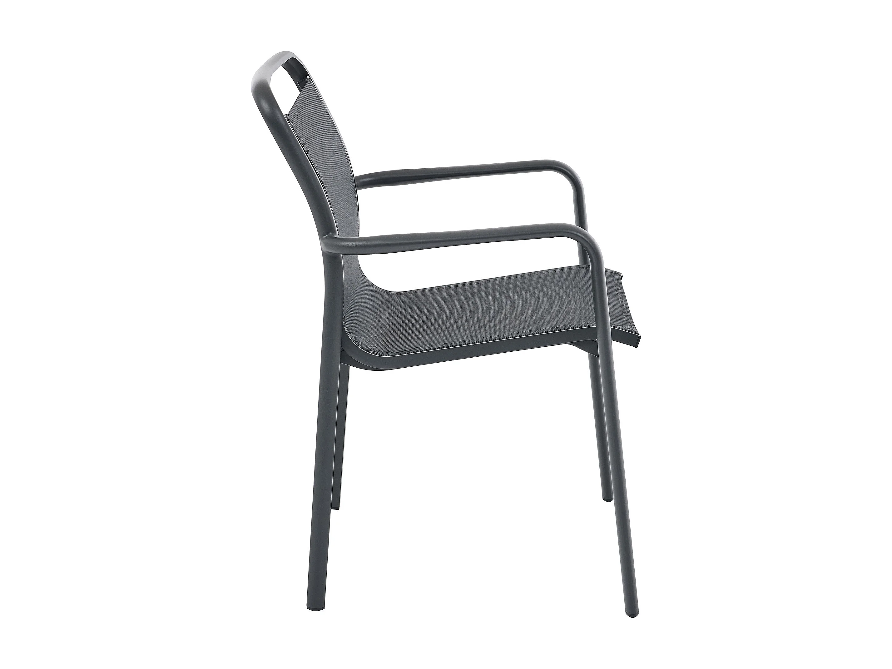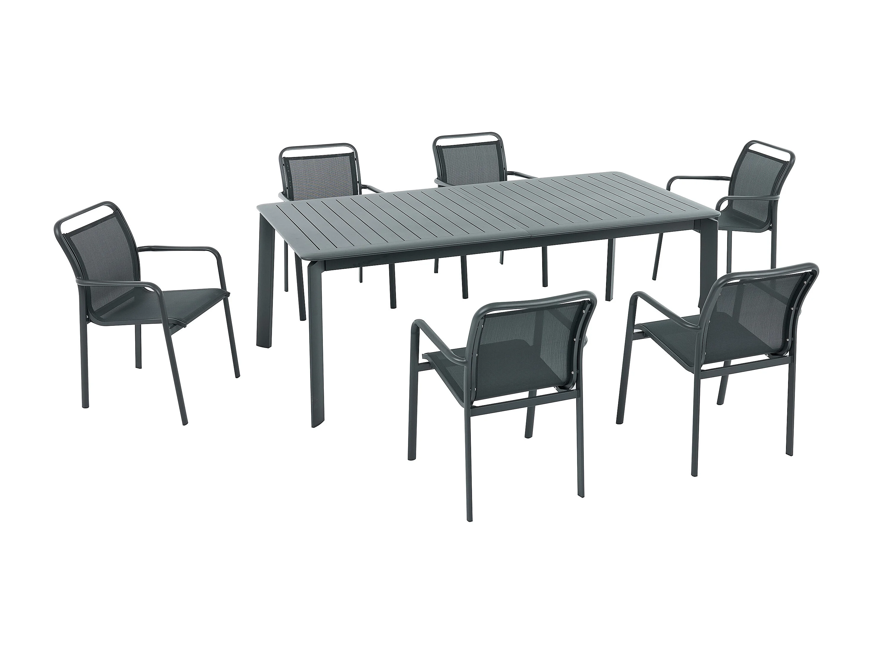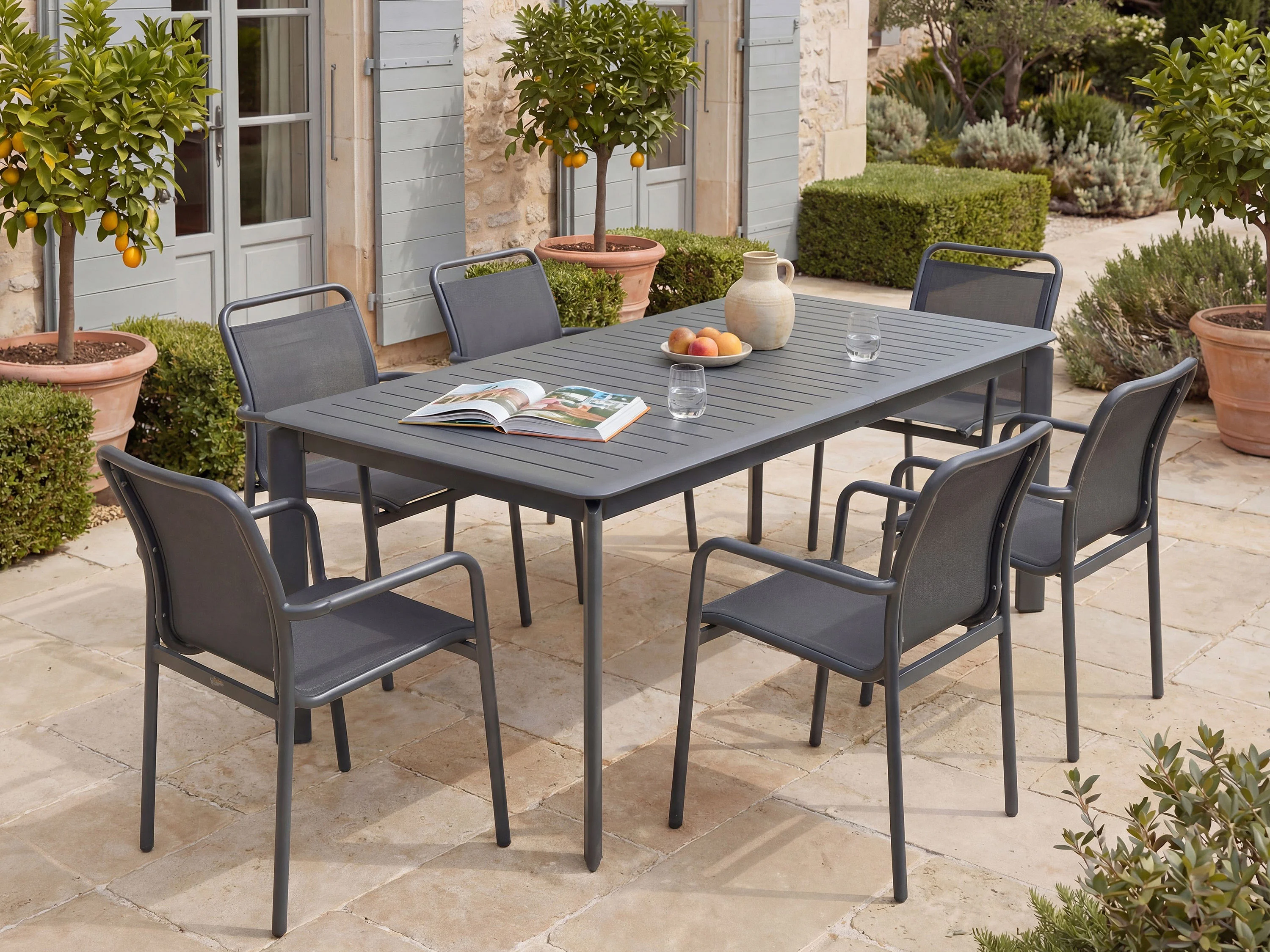 Salle à manger de jardin en aluminium : une table extensible L.205/286.5 cm et 6 fauteuils empilables - Gris foncé - VELYRA de MYLIA