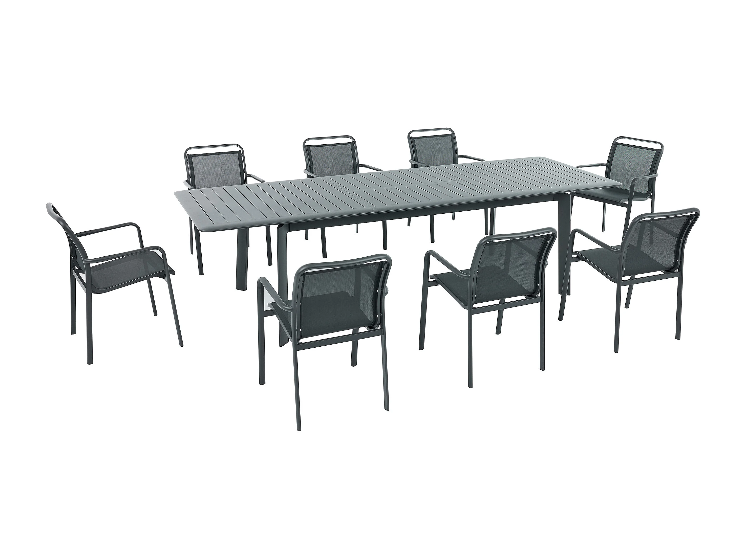 Salle à manger de jardin en aluminium : une table extensible L.205/286.5 cm et 8 fauteuils empilables - Gris foncé - VELYRA de MYLIA