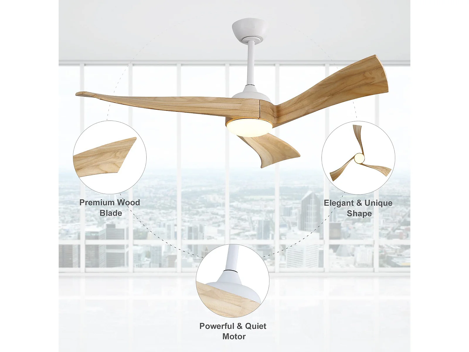 Ventilateur plafond 52" bois massif, moteur CC réversible + télécommande – intérieur/extérieur
