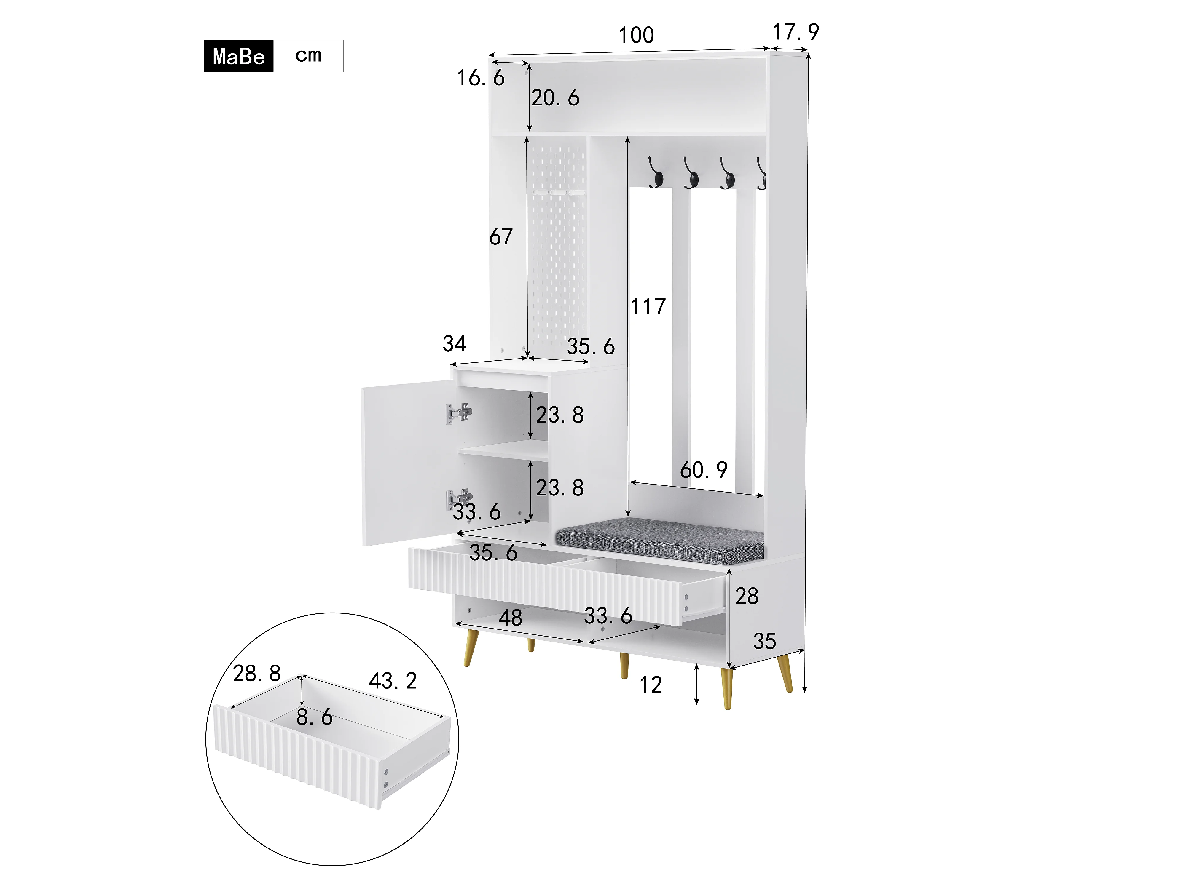 Vestiaire avec 2 tiroirs et 1 porte - 4 patères et banc à chaussures - blanc