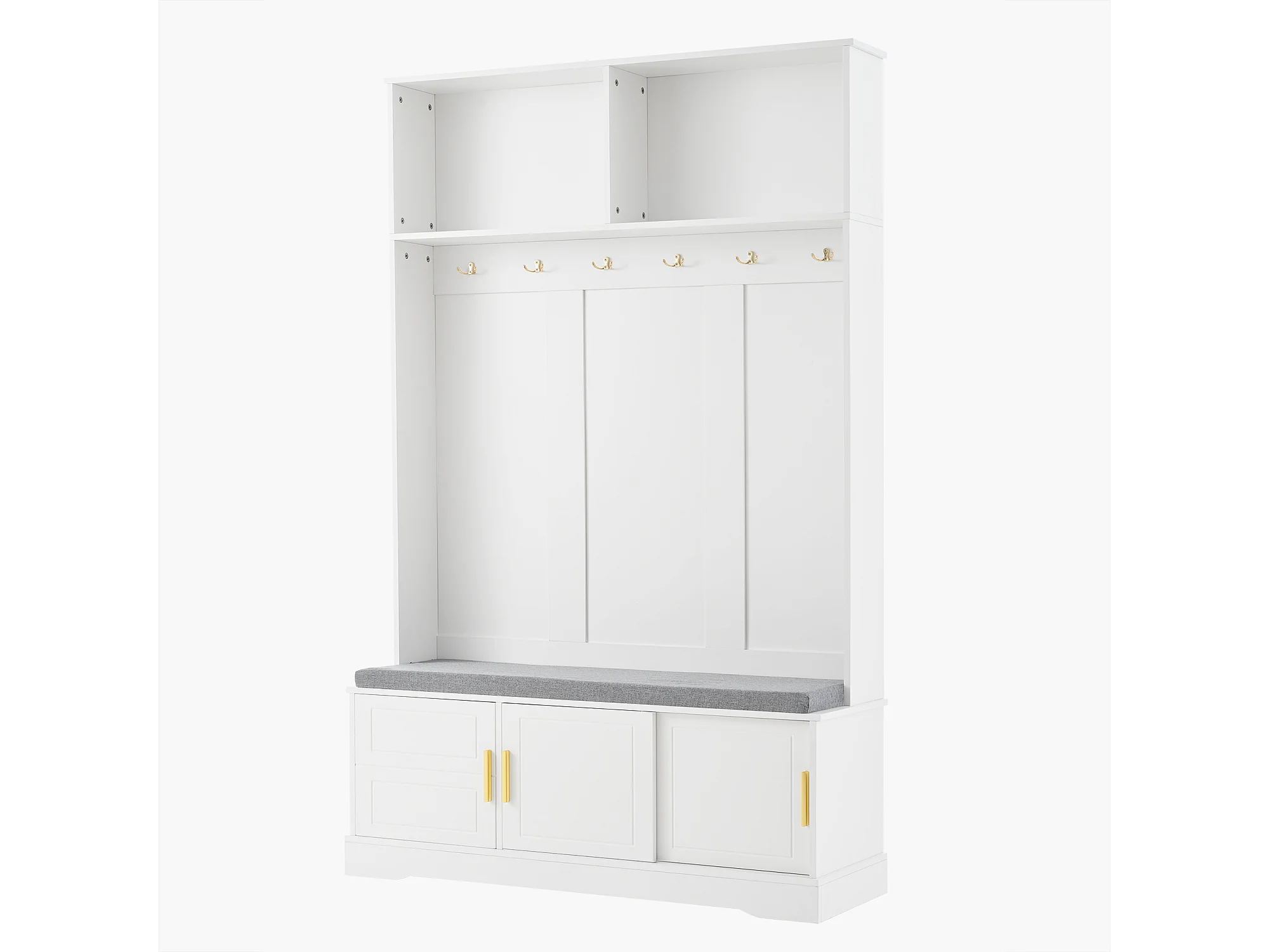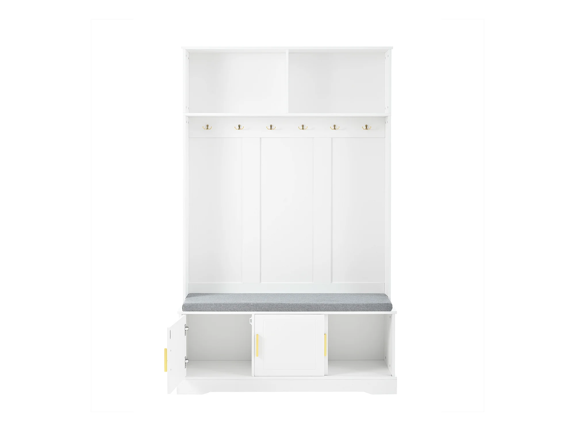 Vestiaire blanc avec 3 portes, banc à chaussures et 6 crochets, simple et polyvalent 120×40×191 cm