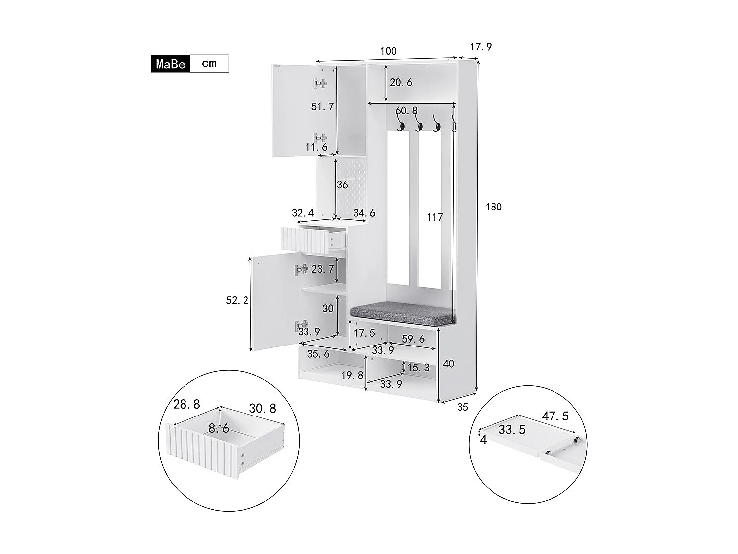 Vestiaire blanc ensemble complet banc 4 crochets portes tiroirs compact