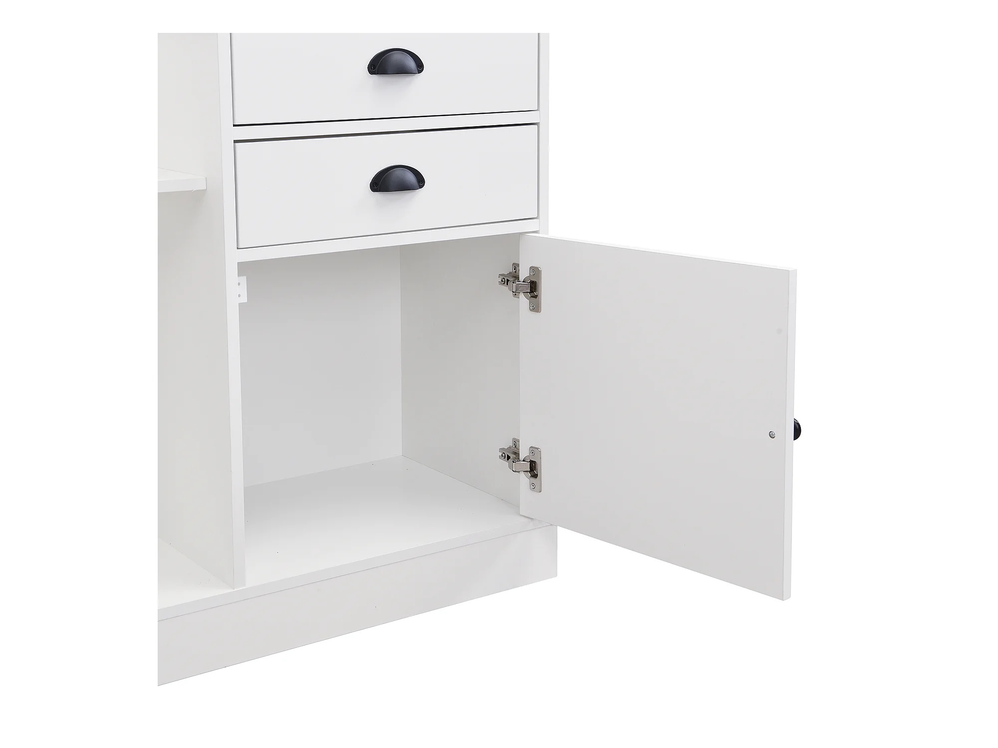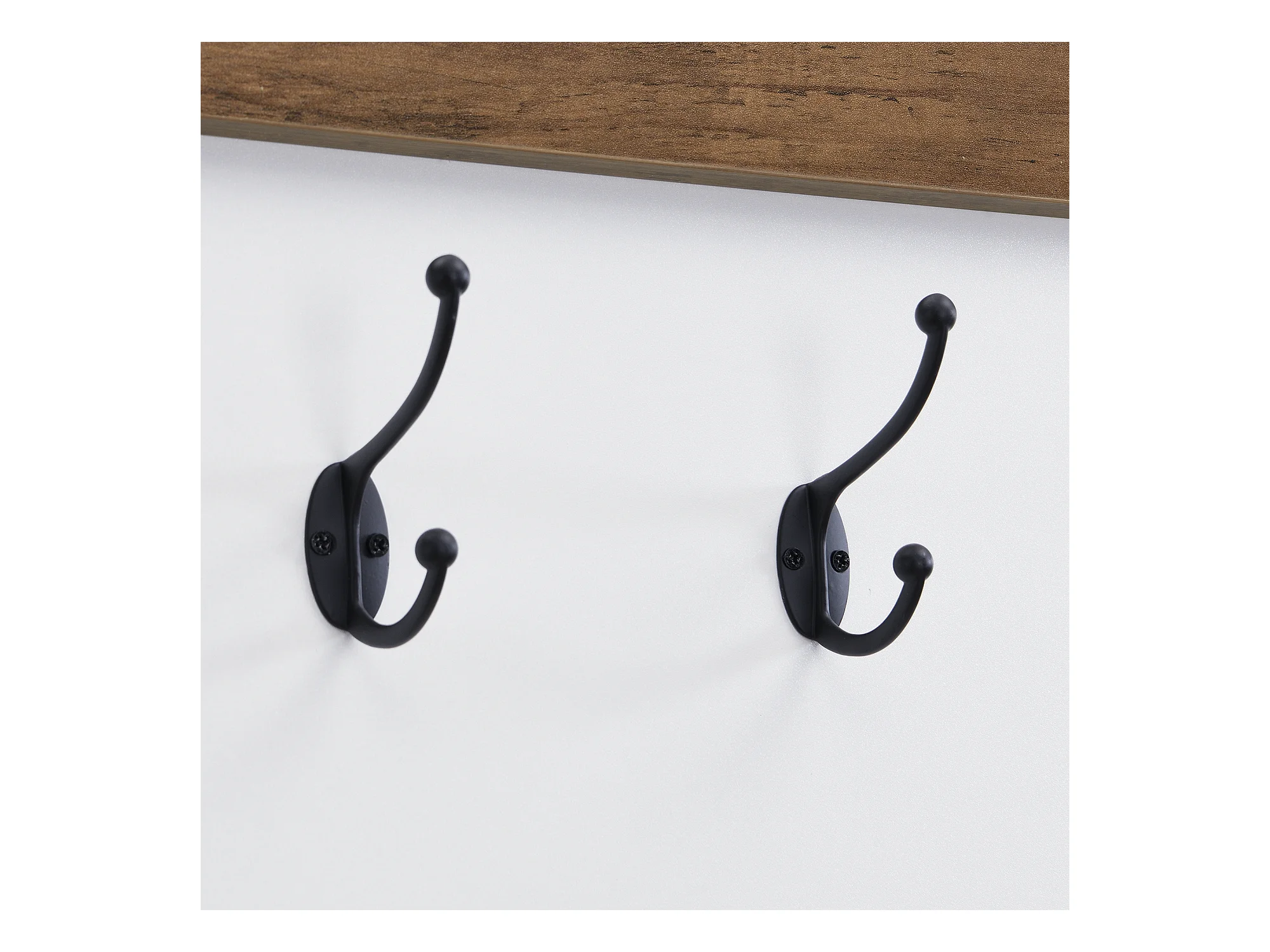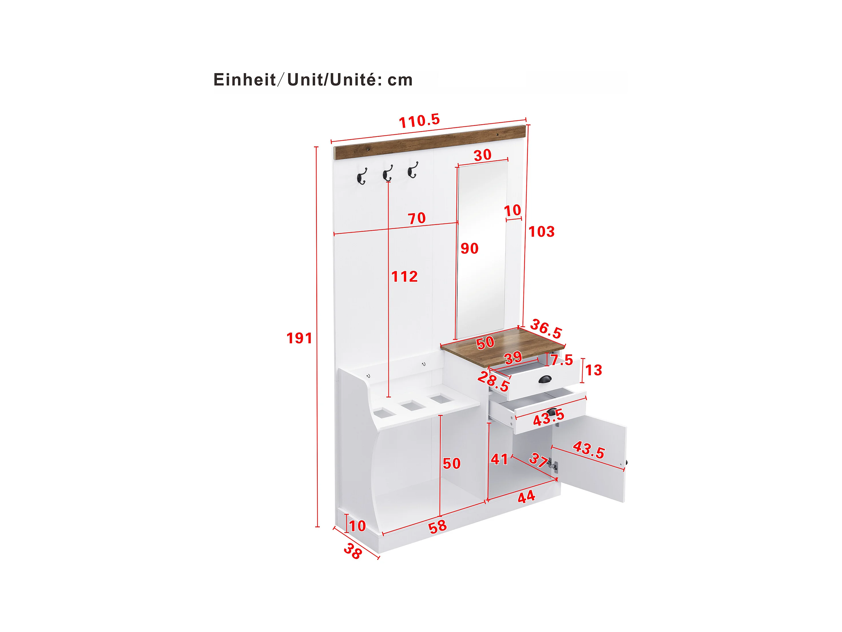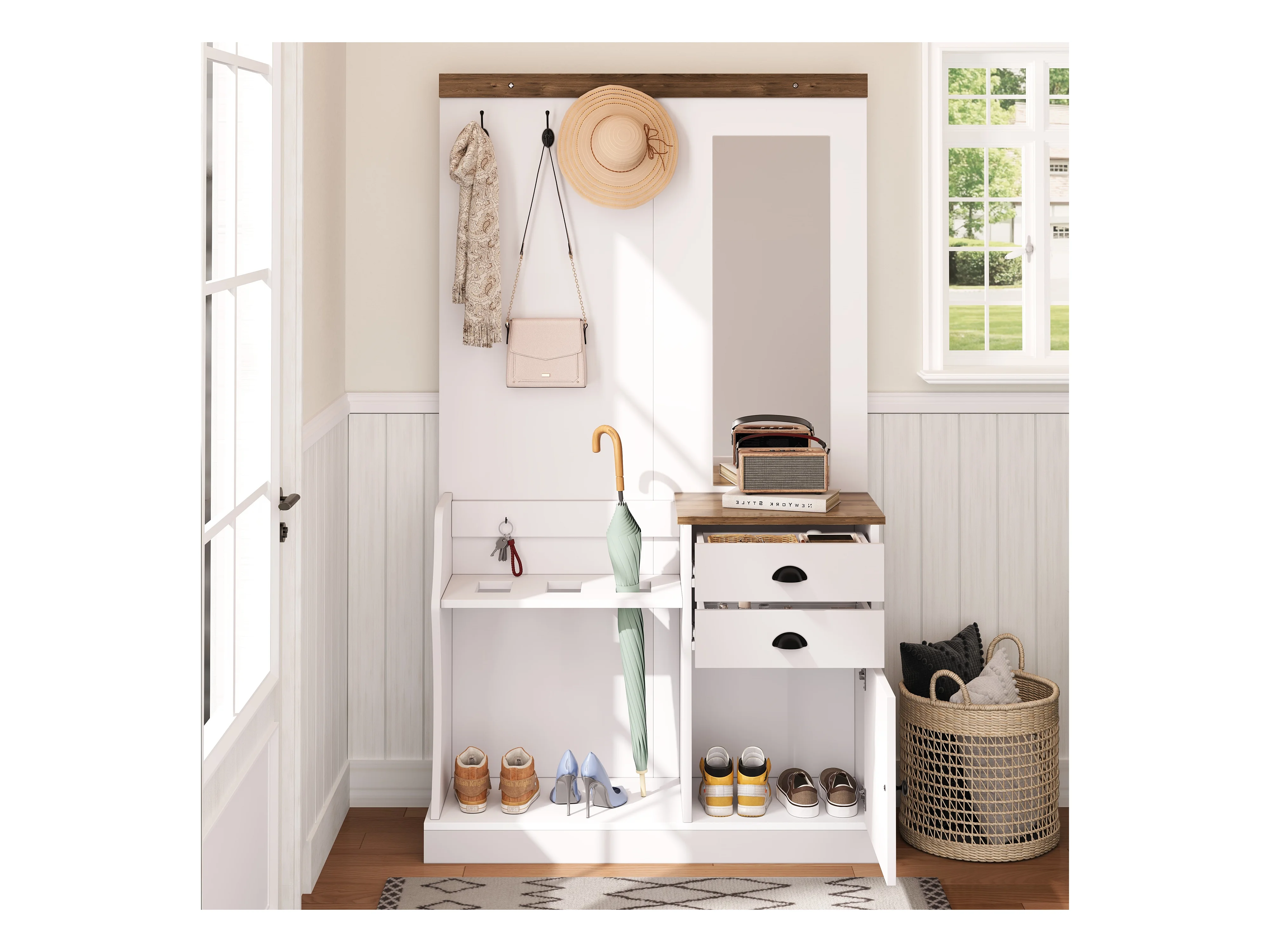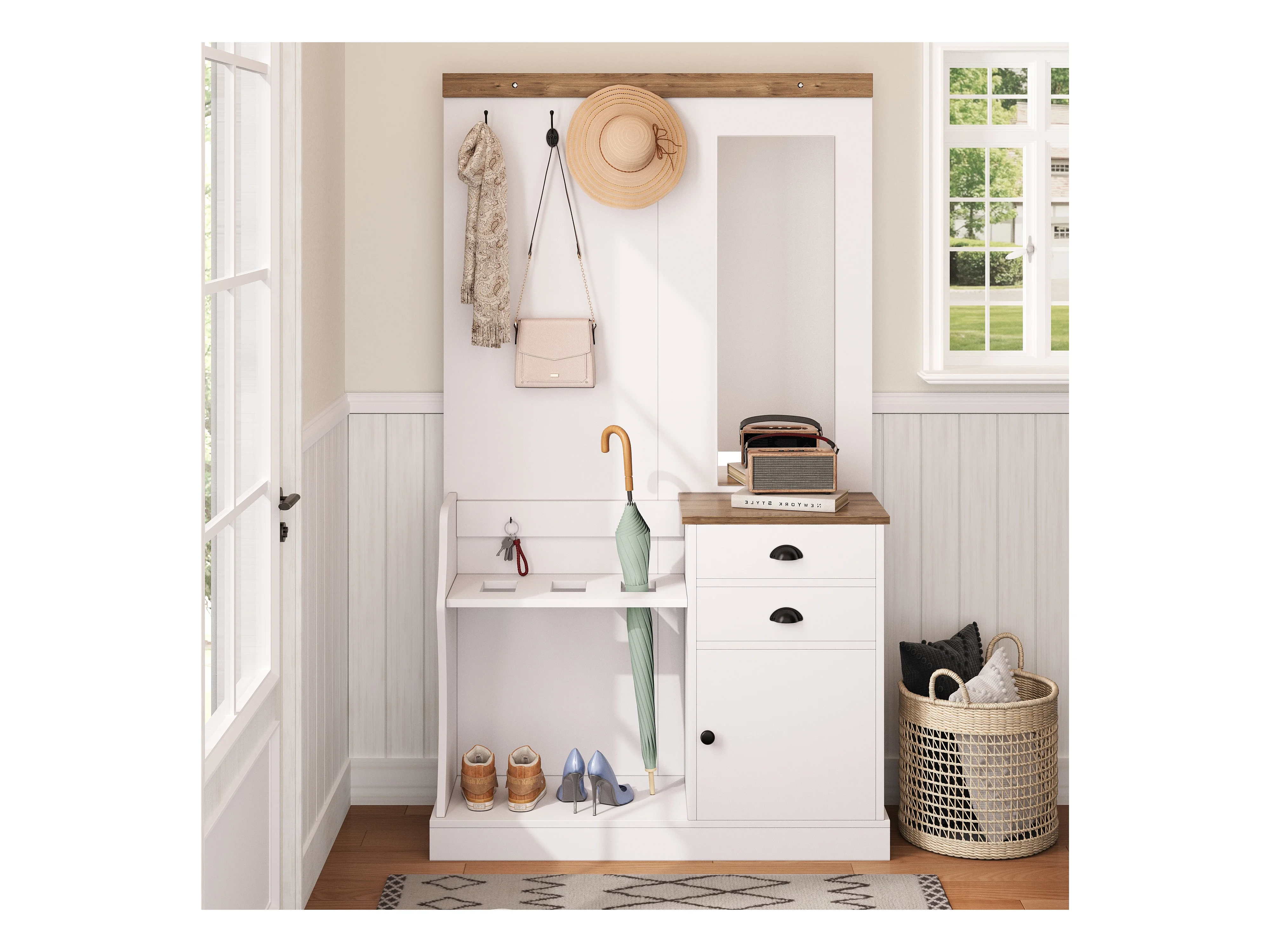 Vestiaire blanc et bois avec miroir, 2 tiroirs, 1 porte, patères et porte-parapluie 110,5x38x191cm
