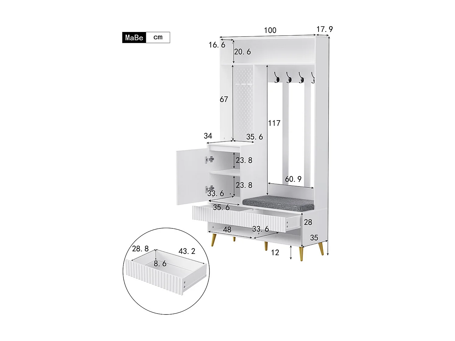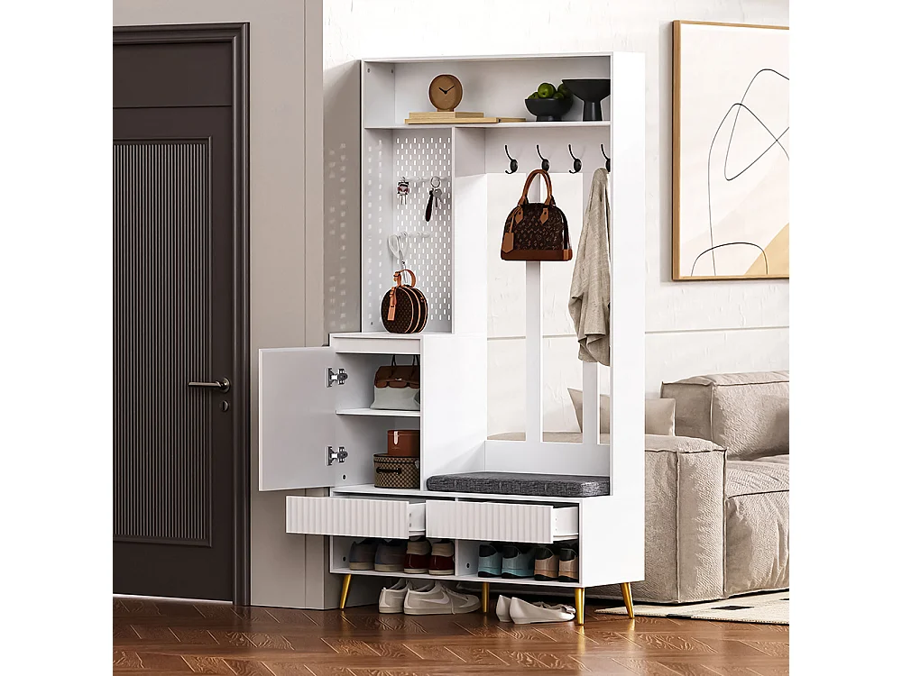 Vestiaire blanc porte-manteau mural banc à chaussures 4 crochets deux tiroirs 1 porte