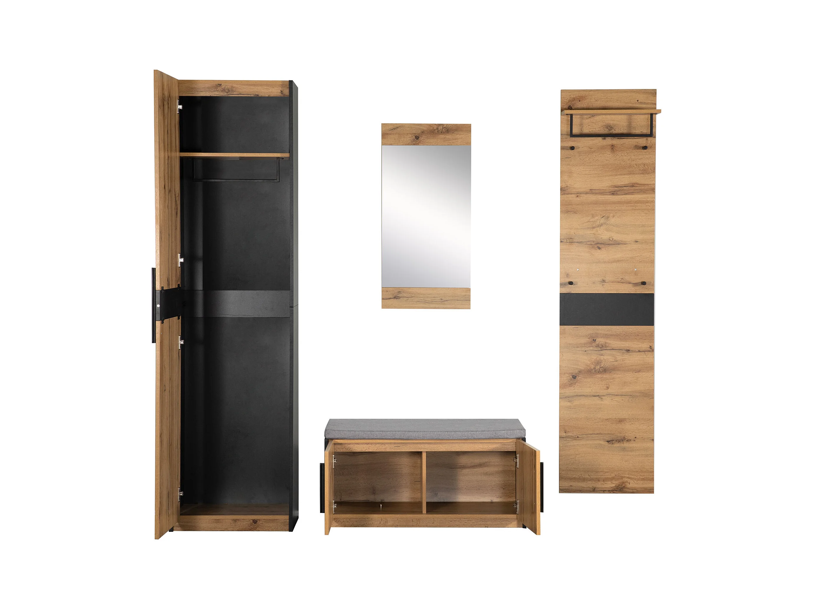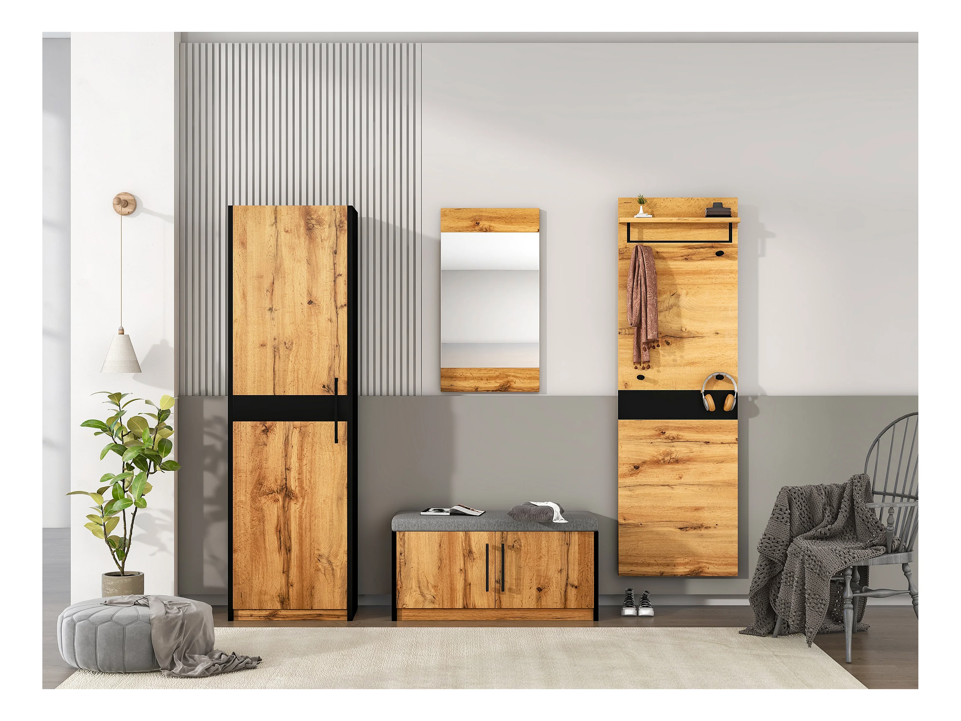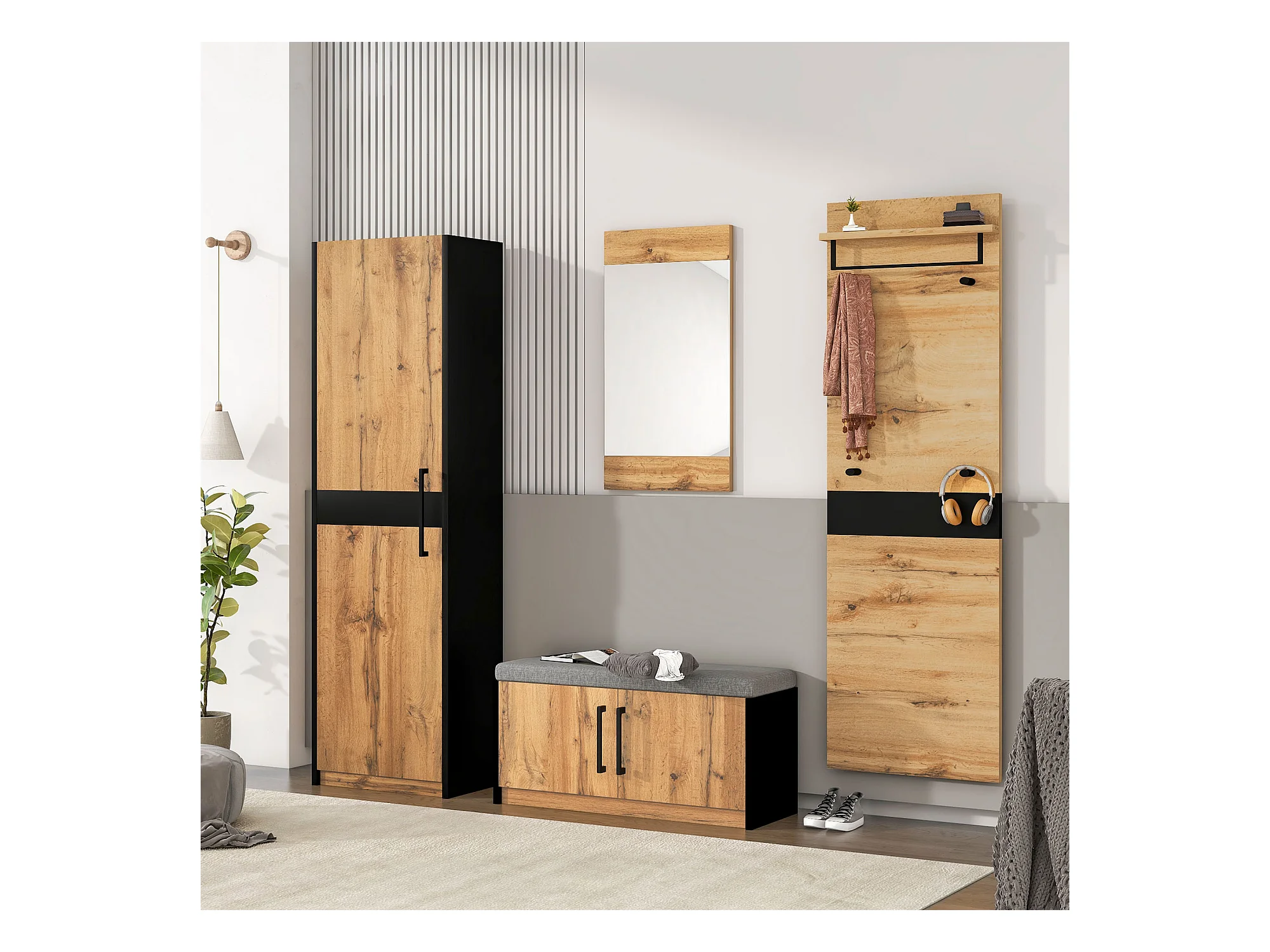 Vestiaire d'entrée avec miroir + armoire + banc à chaussures - style campagnard - naturel foncé