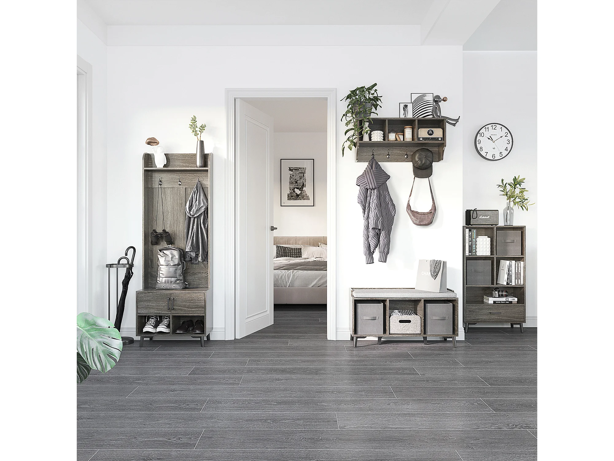 Vestiaire d'entrée style industriel - 3 patères doubles, 2 portes, 2 niches, étagère, banc - métal noir panneaux aspect bois gris