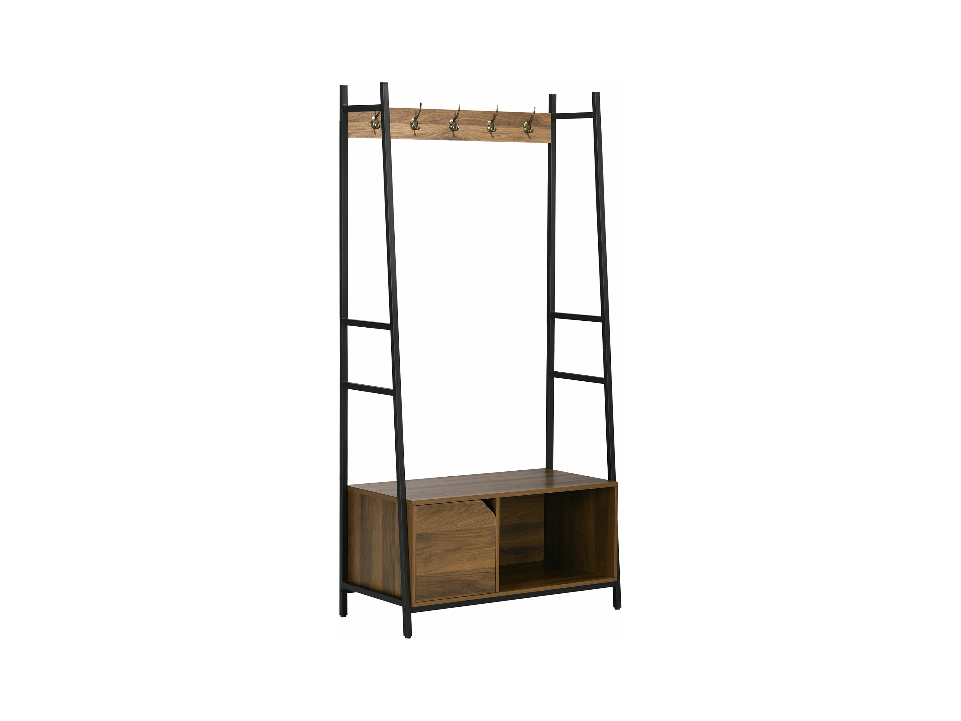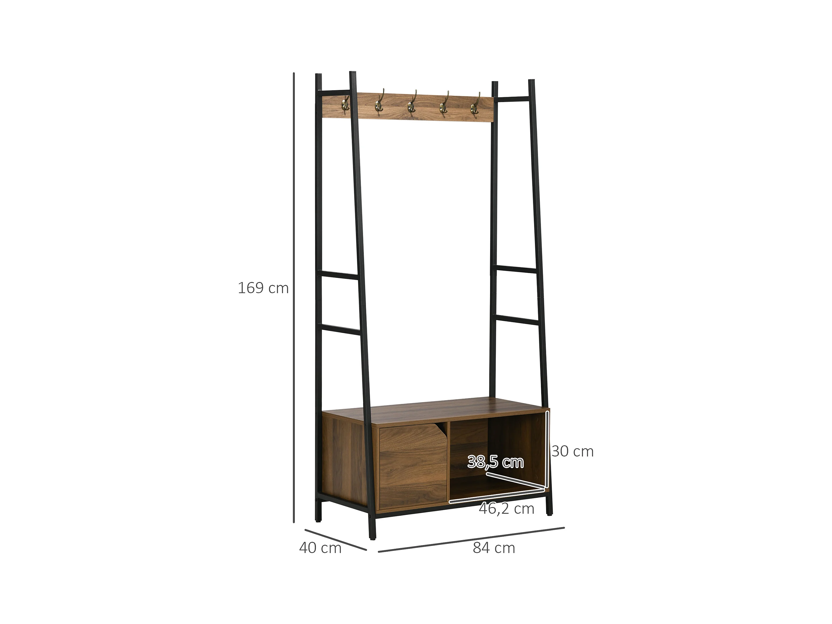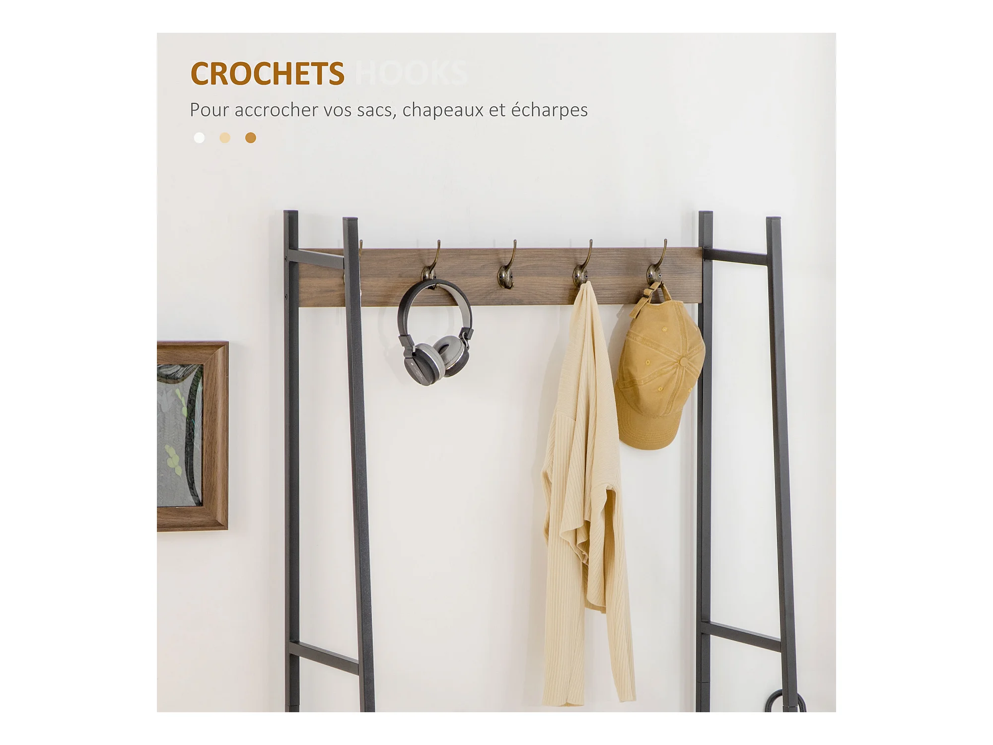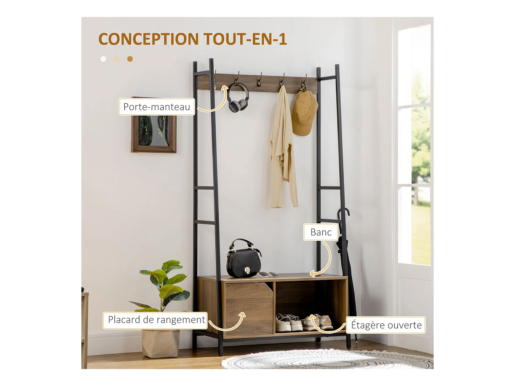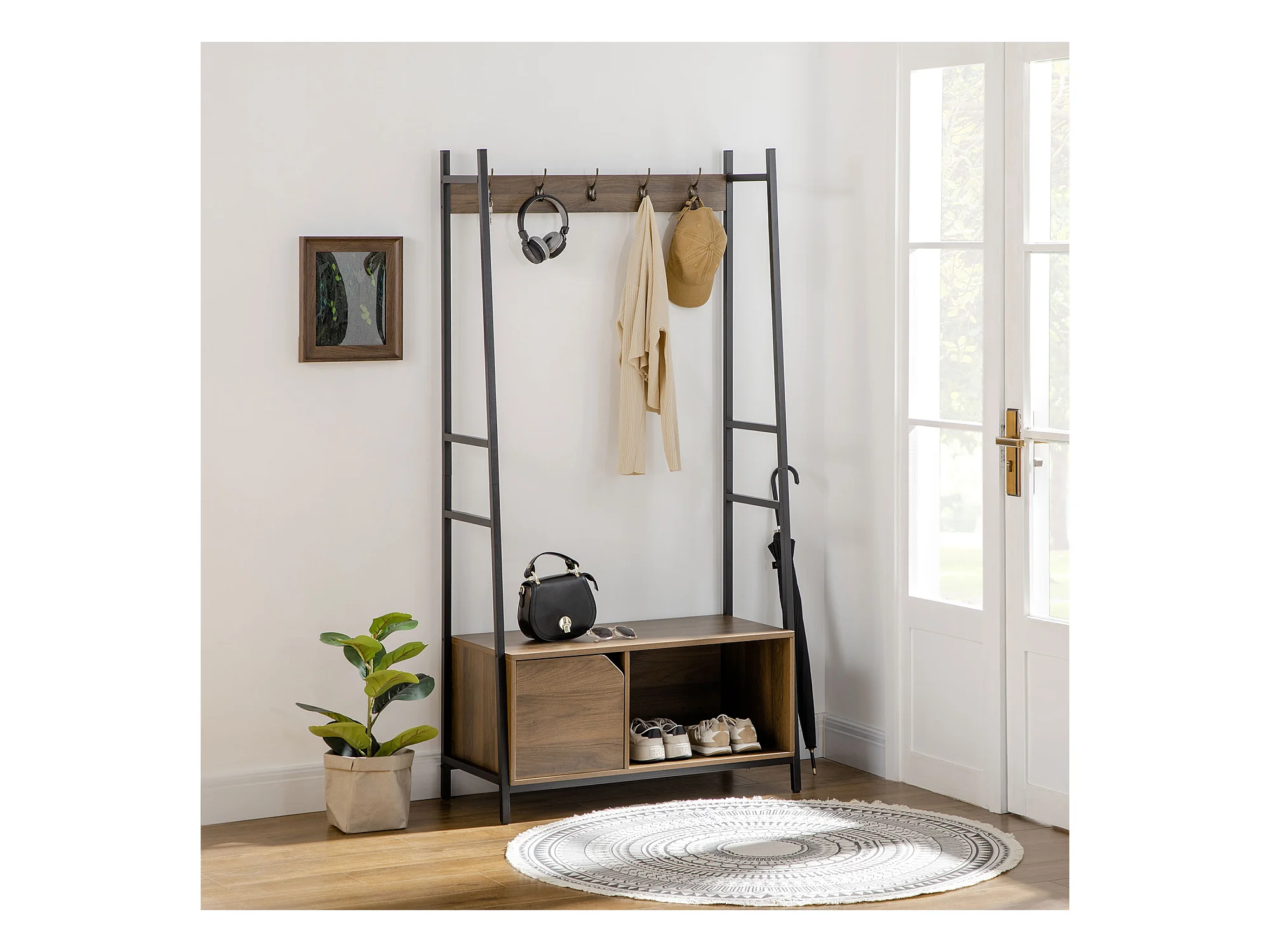 Vestiaire d'entrée style industriel - 5 patères doubles, placard porte, niche, banc - dim. 84L x 40l x 169H cm - métal noir panneaux aspect bois