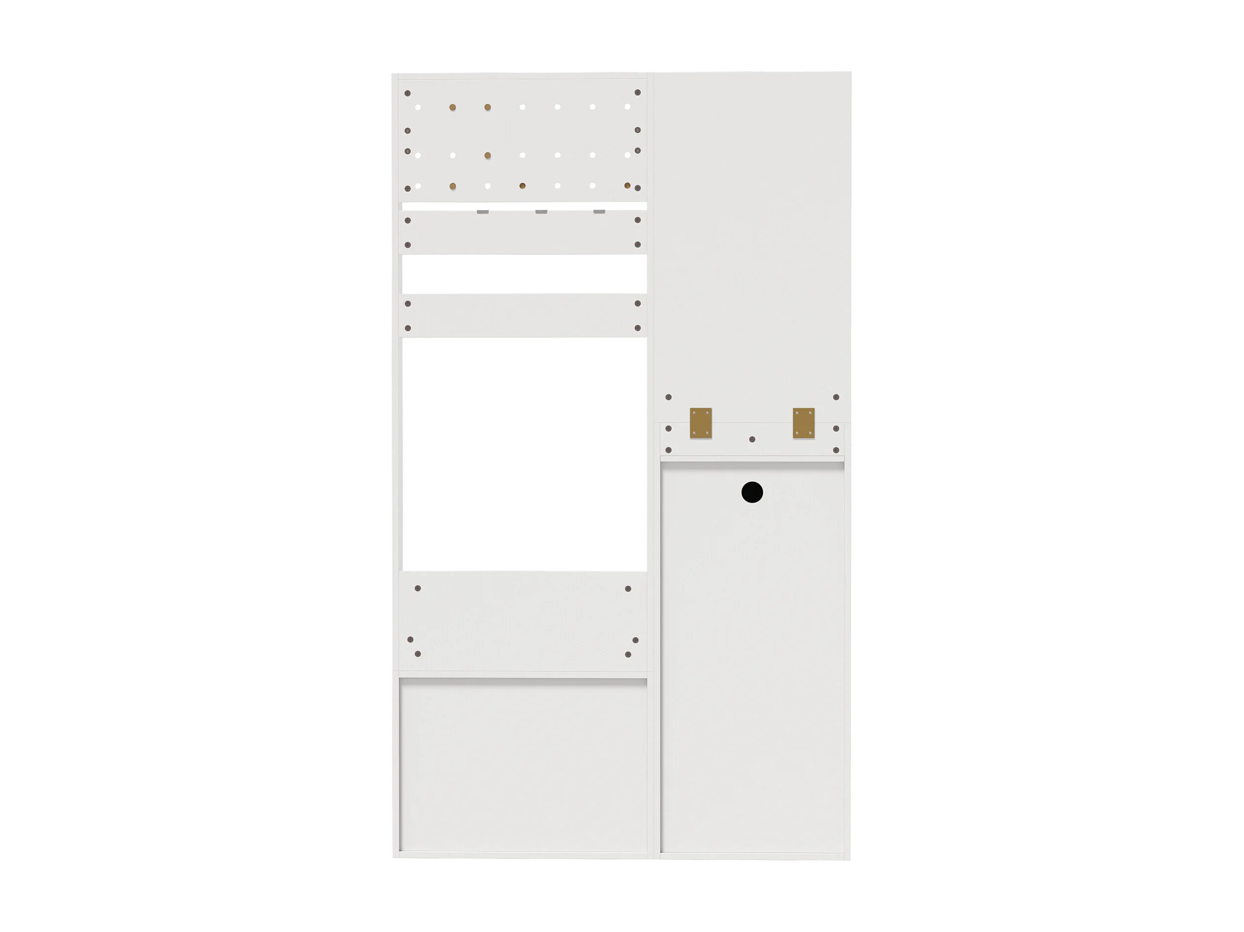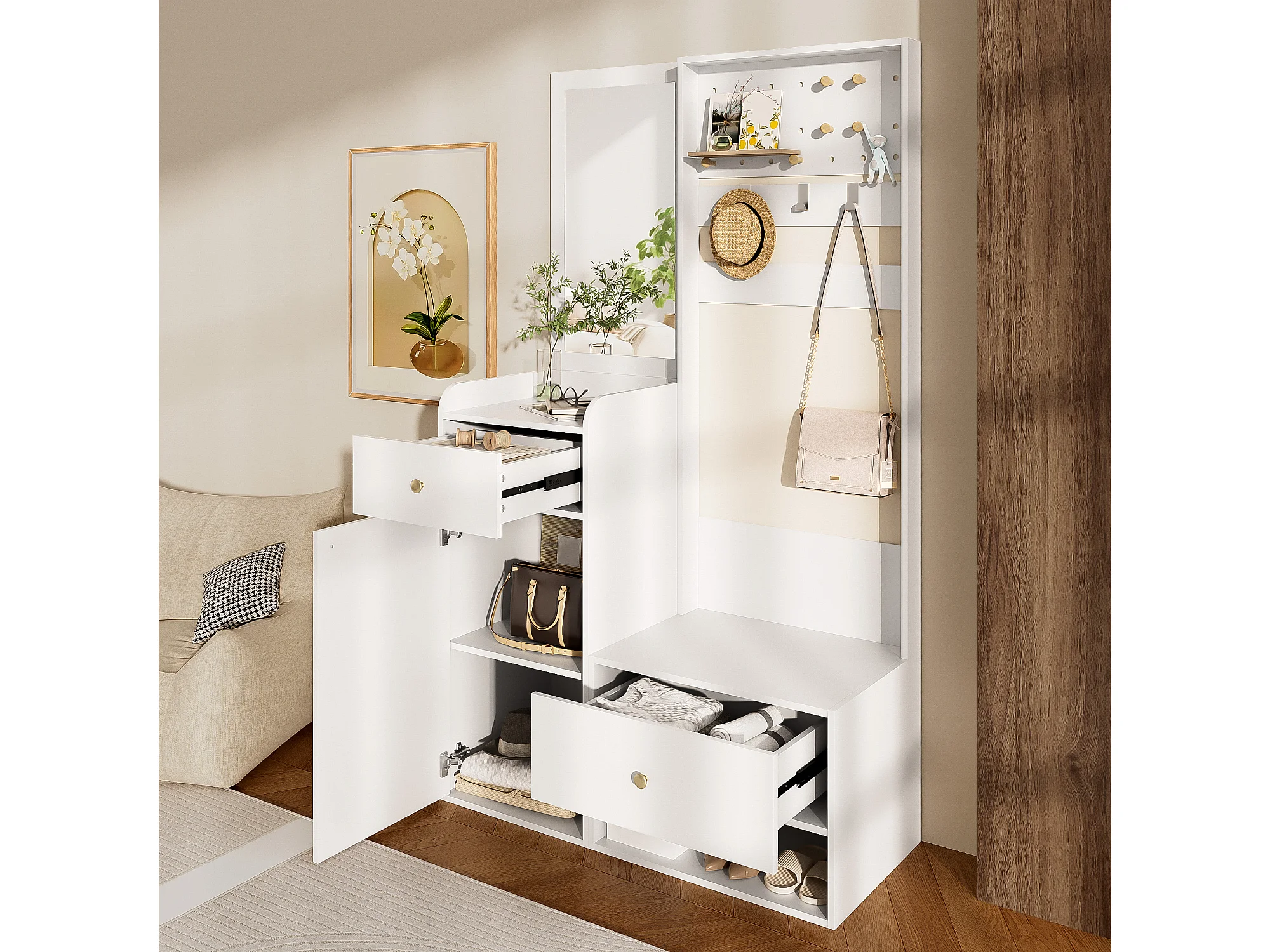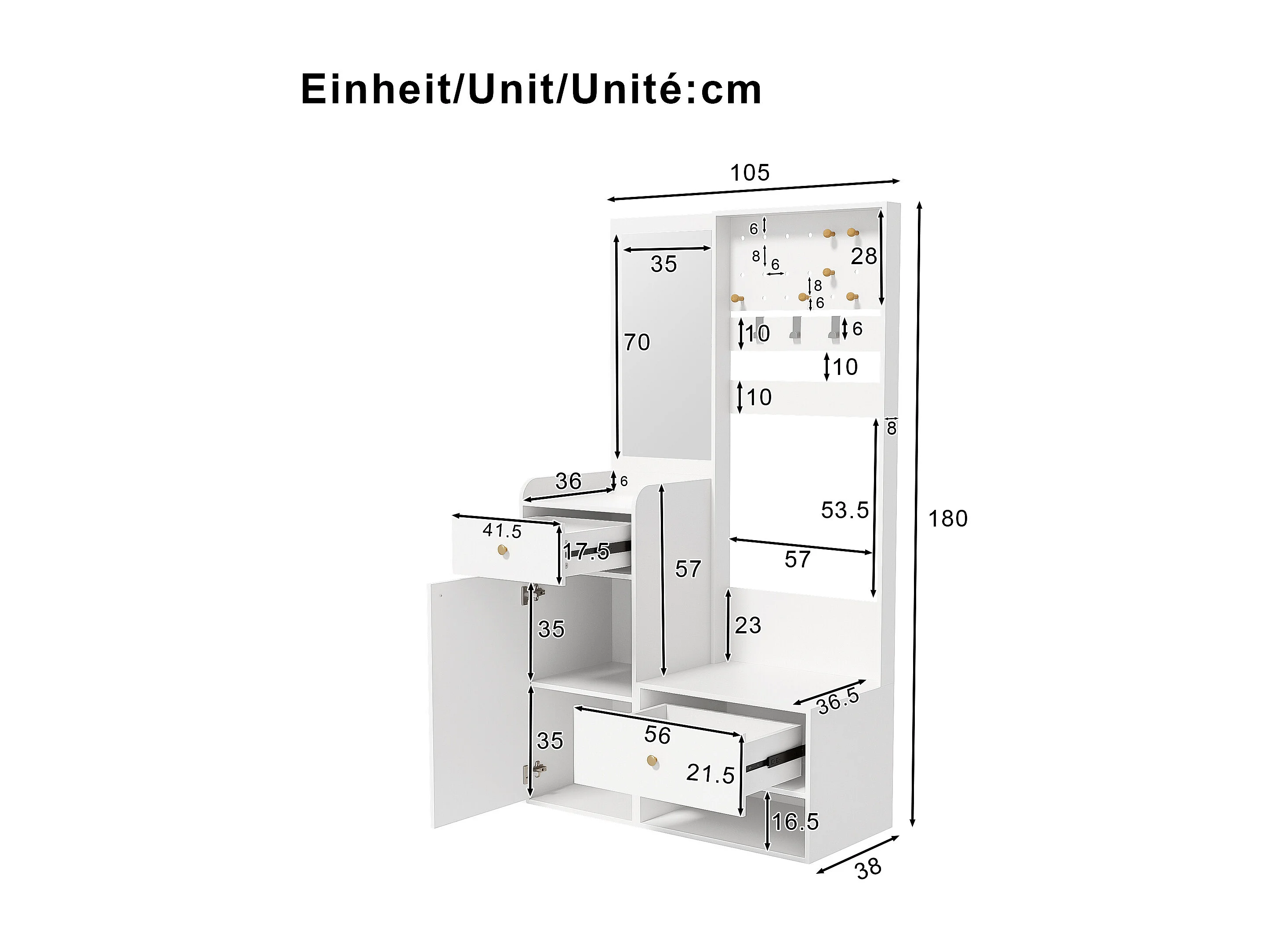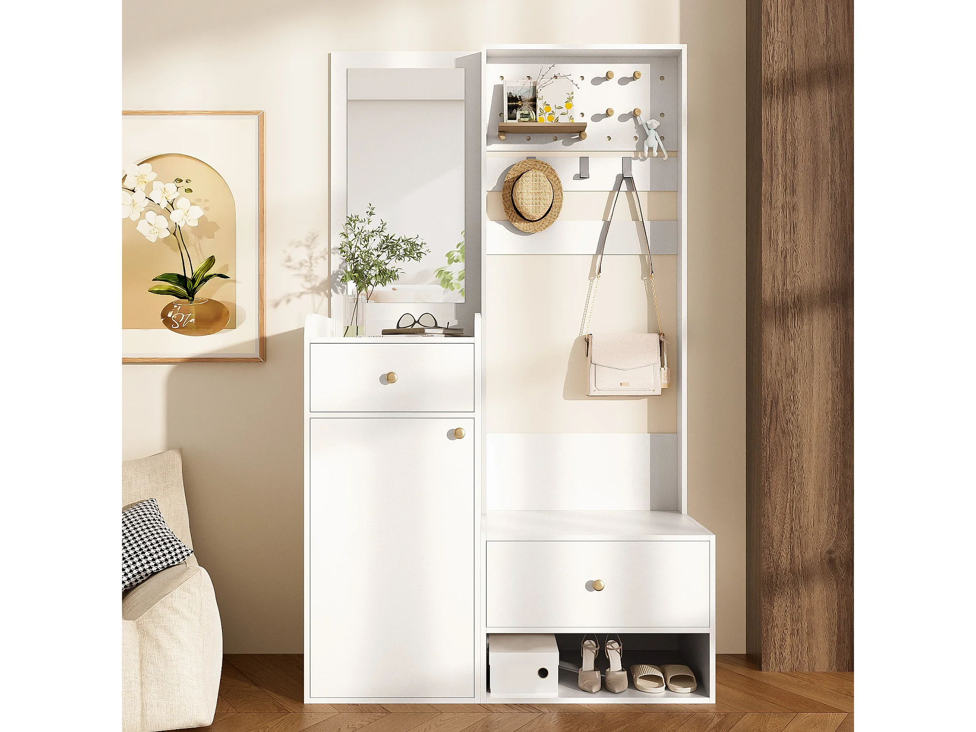 Vestiaire moderne 105x38x180 cm avec miroir, crochets et étagères, rangement, panneaux de particules blanc