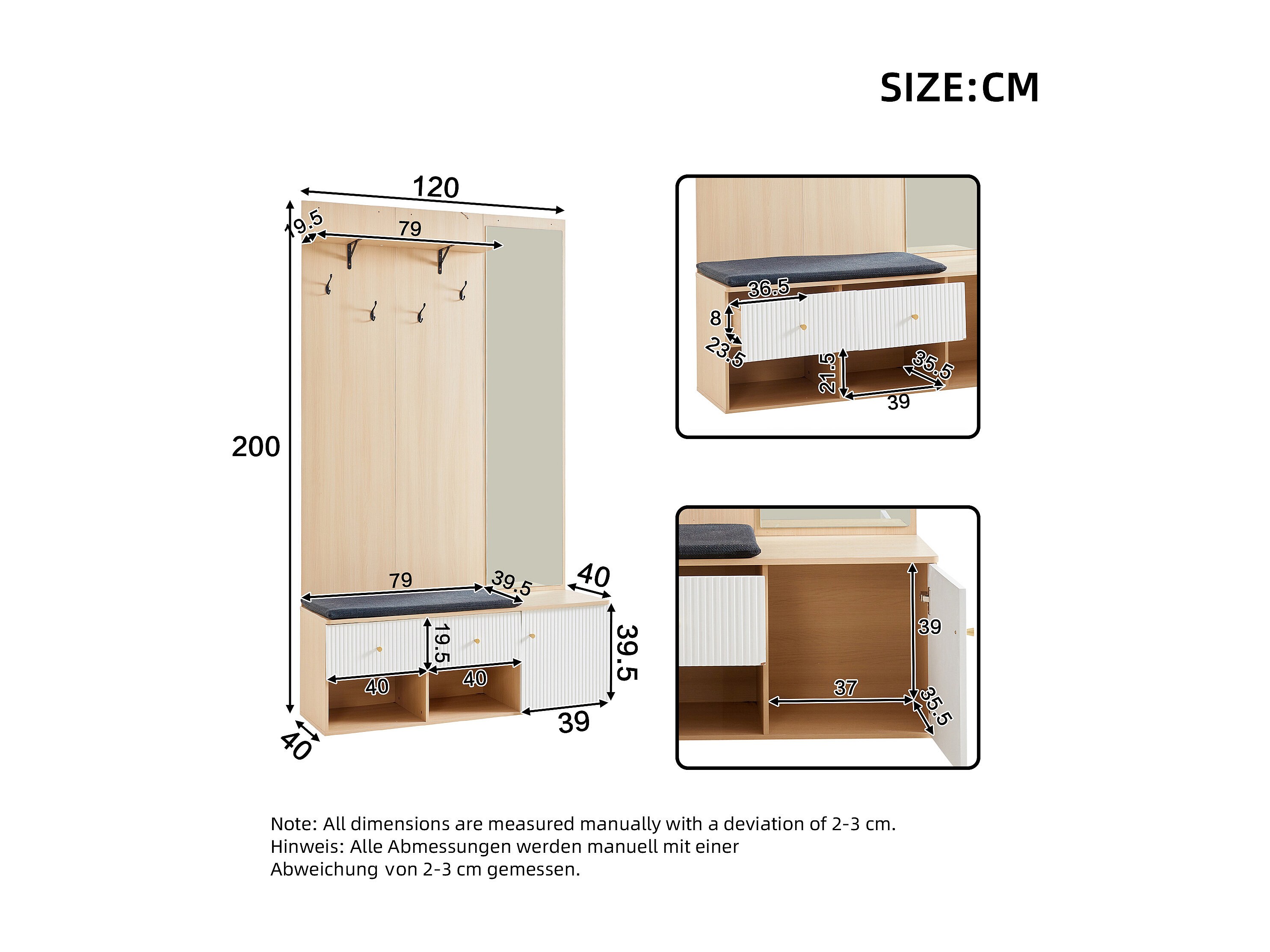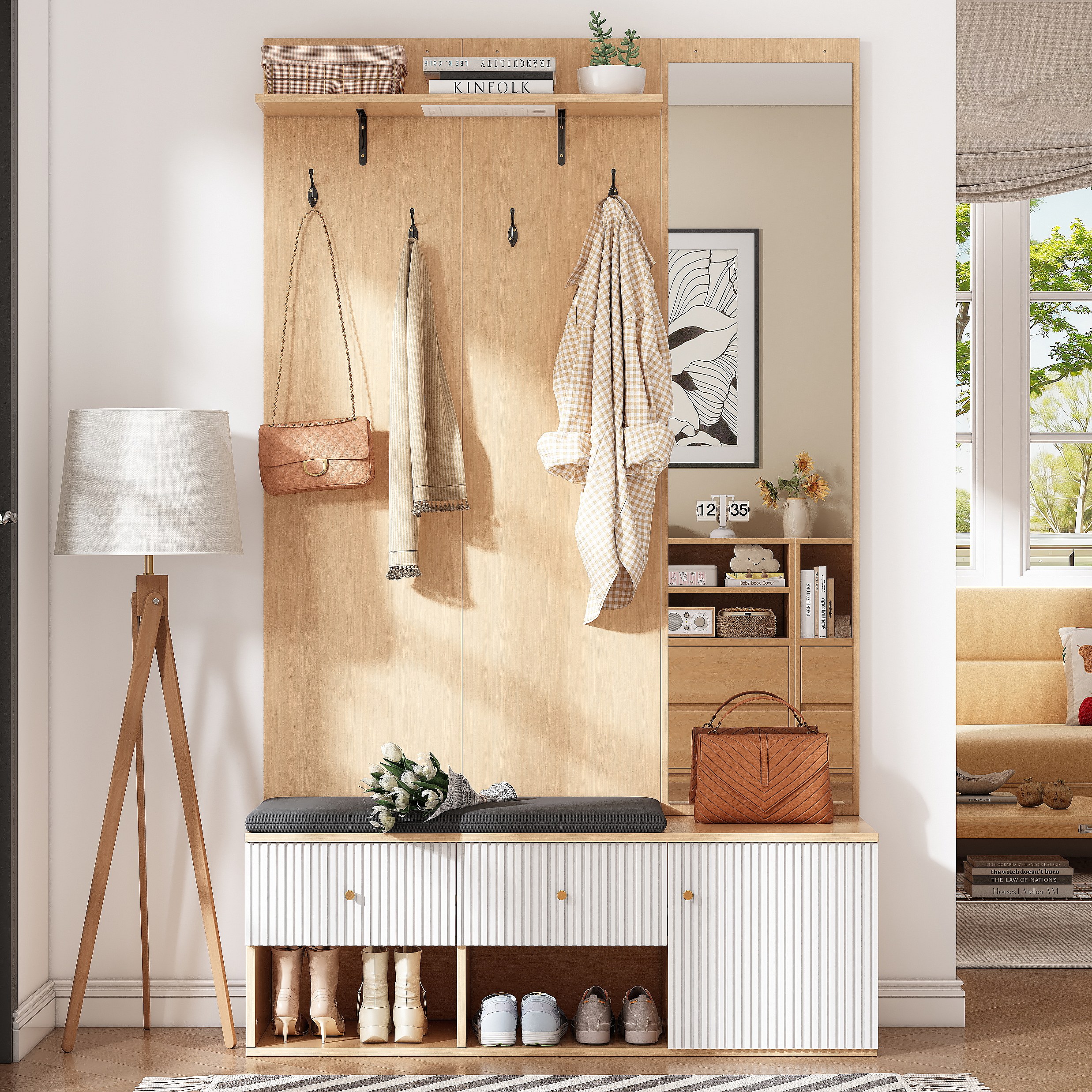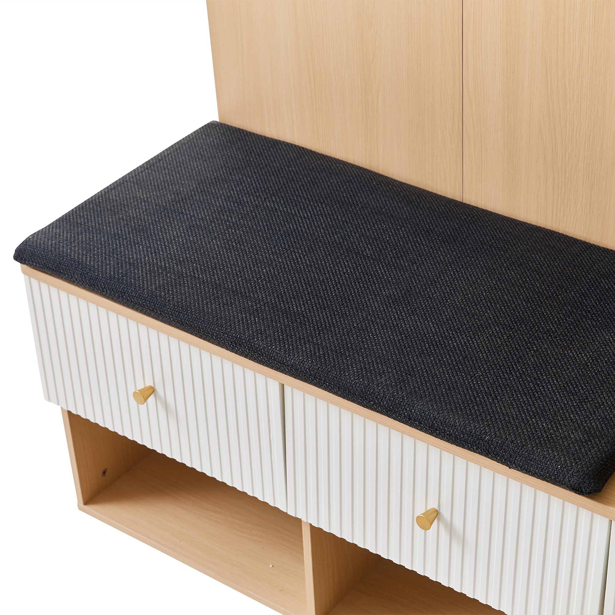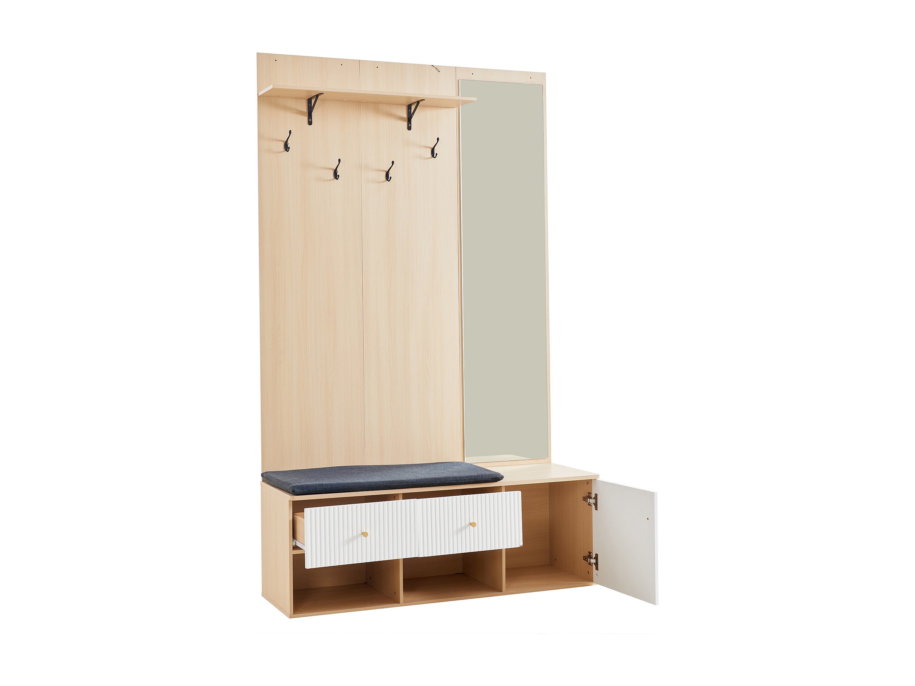 Vestiaire naturel et blanc avec 2 tiroirs, 1 porte , miroir, banc et coussins 120x40x200 cm