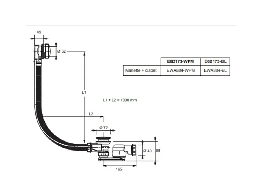 Vidage baignoire extra plat JACOB DELAFON câble long (1m) noir mat