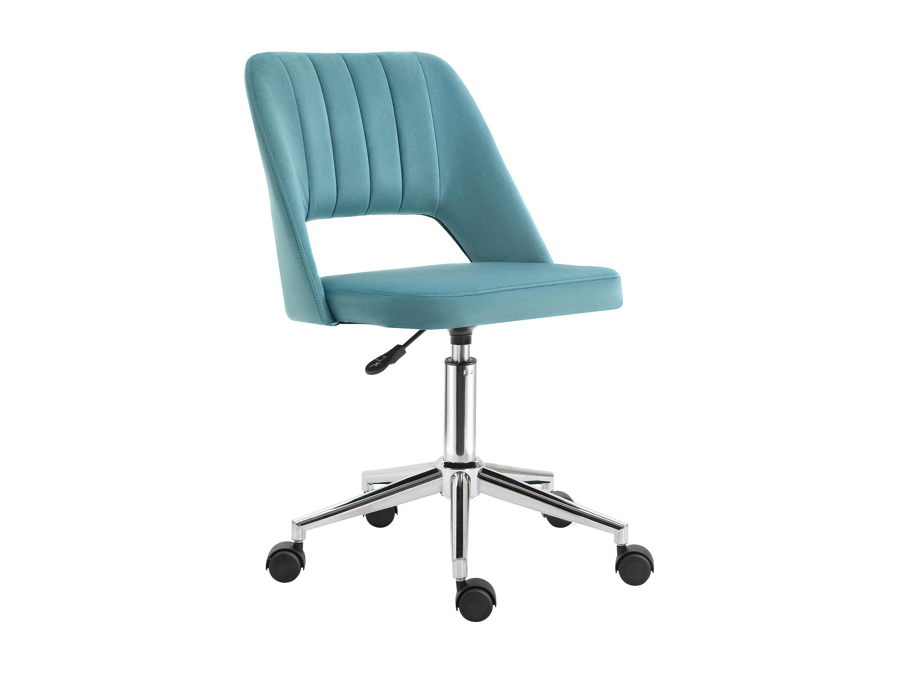 Chaise de bureau design contemporain dossier ergonomique ajouré strié hauteur réglable pivotante 360° piètement chromé velours bleu canard