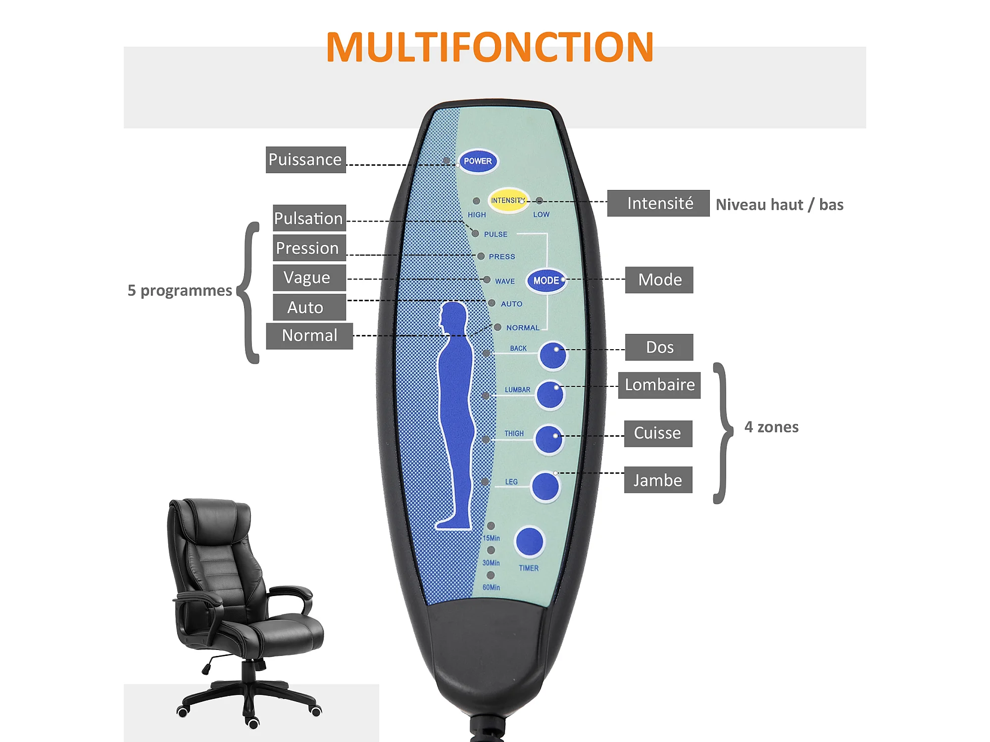 Fauteuil de bureau direction massant grand confort hauteur réglable fonction dossier à bascule revêtement synthétique noir