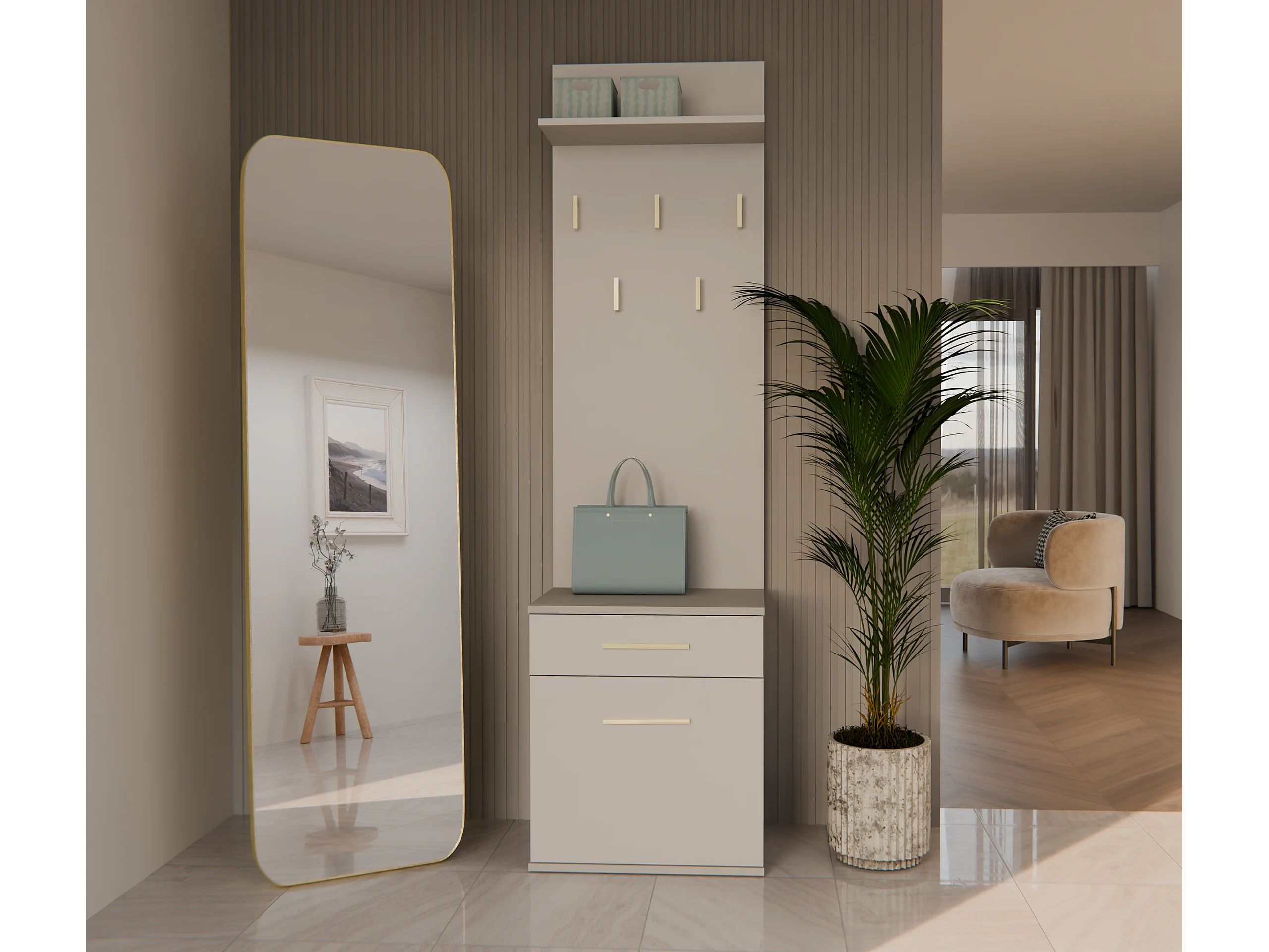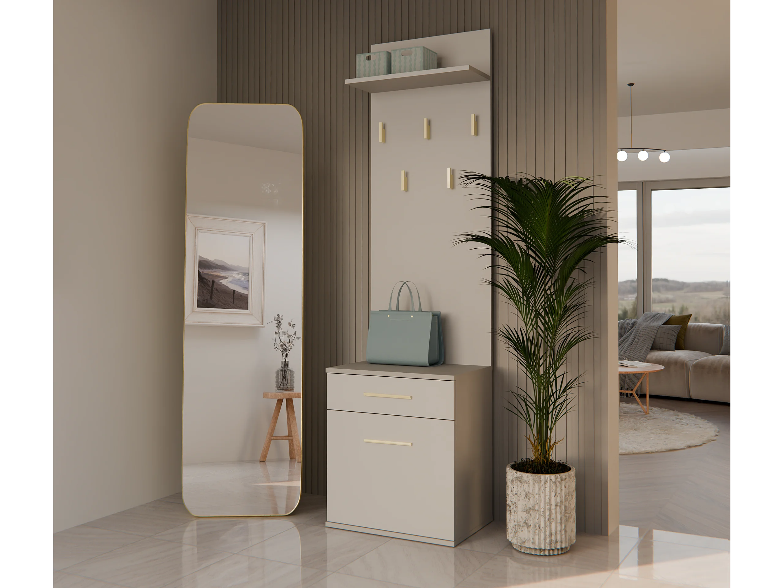 SHEILA - Vestiaire d'entrée avec miroir - Armoire + porte-manteau - Rangements chaussures - Beige
