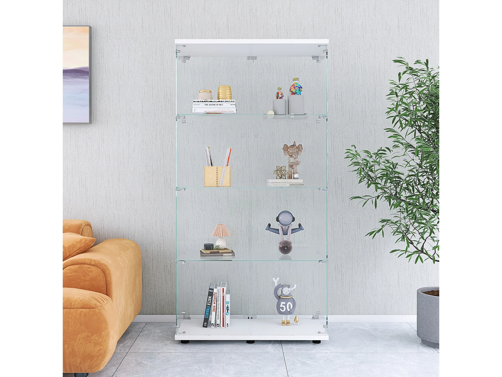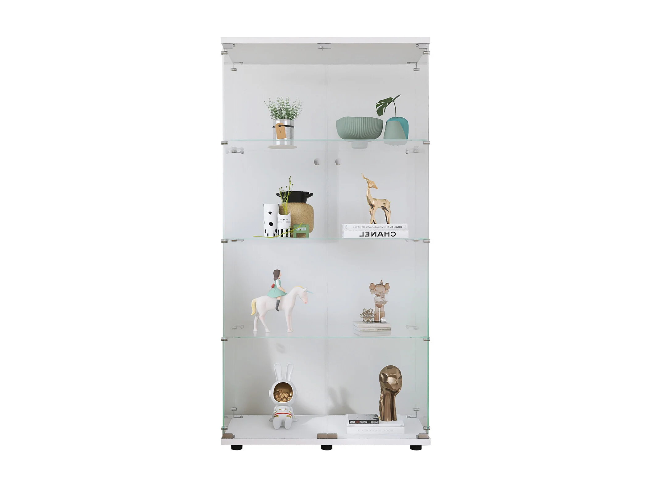 Vitrine à deux portes et quatre étagères, bibliothèque sur pied pour salon, chambre ou bureau, 164,5 cm x 80,5 cm x 36,3 cm, blanche