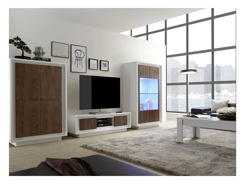 Vitrine à LED 2 portes bois laqué blanc et noyer Mafer L 106cm