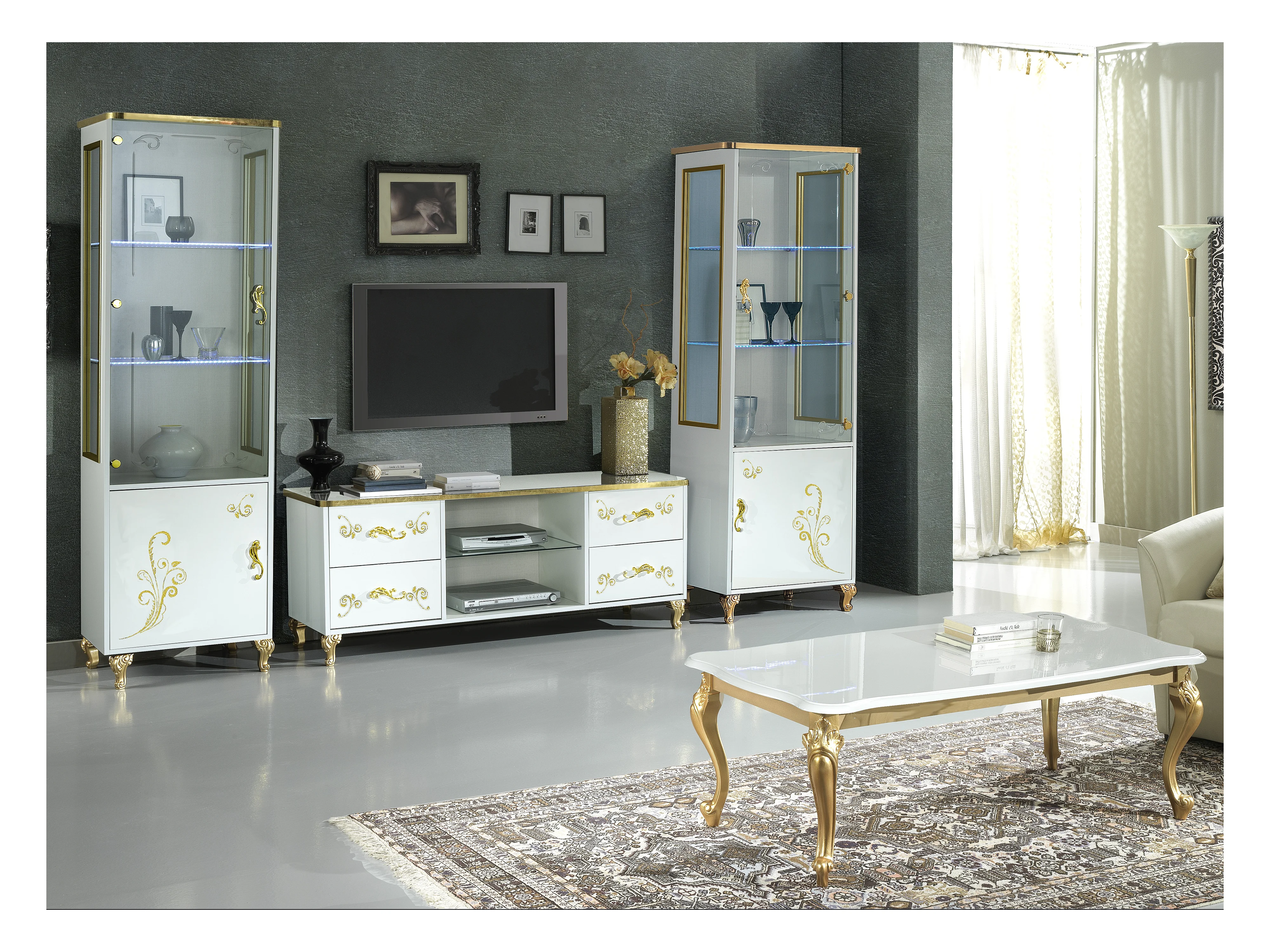 Vitrine à LED 2 portes bois vernis brillant blanc et doré Jade 60cm