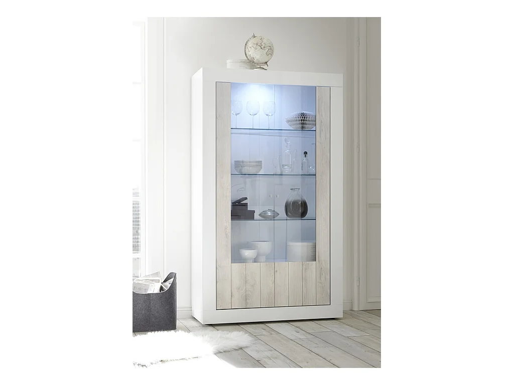 Vitrine à LED 2 portes laqué blanc brillant et pin gris Pilari L 110cm