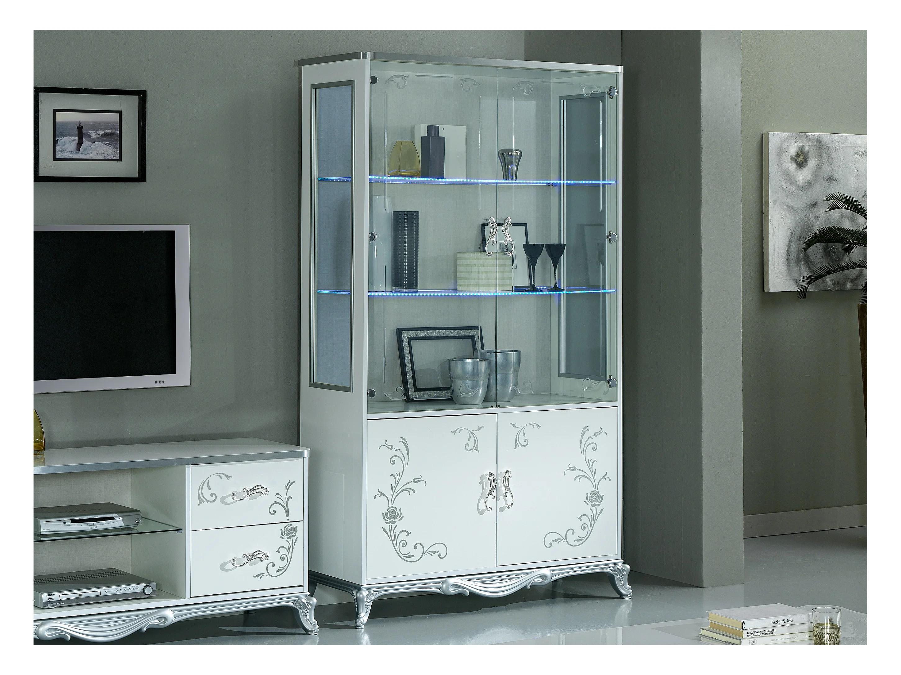 Vitrine à LED 4 portes bois laqué blanc et argent Dannie
