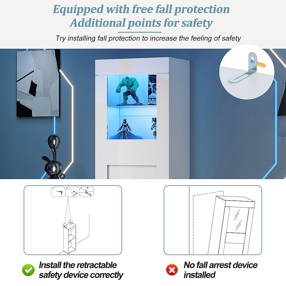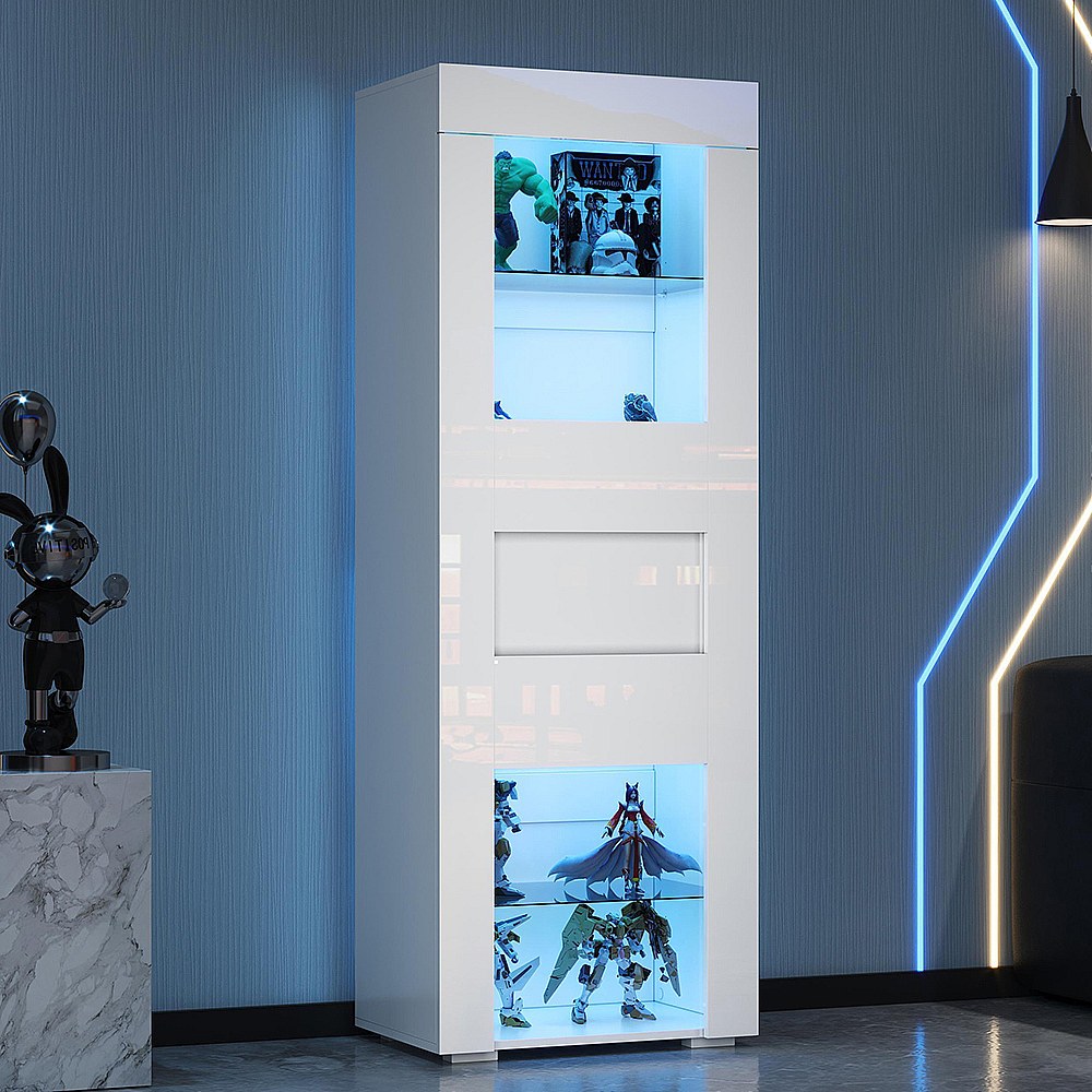 Vitrine armoire de rangement LED brillante porte acrylique 2 étagères verre buffet haut salon canapé blanc